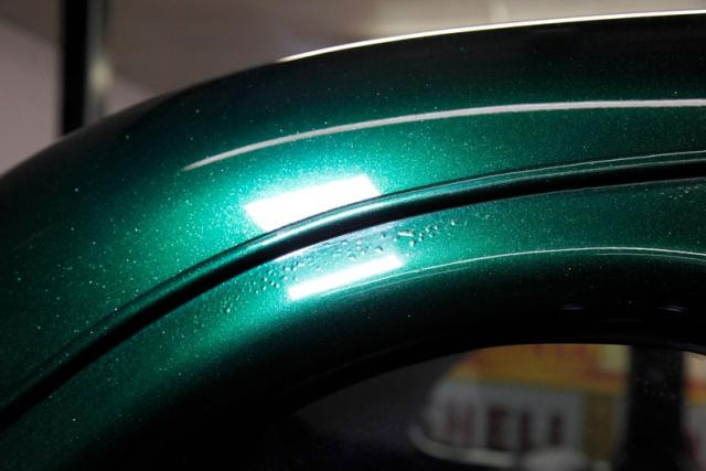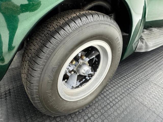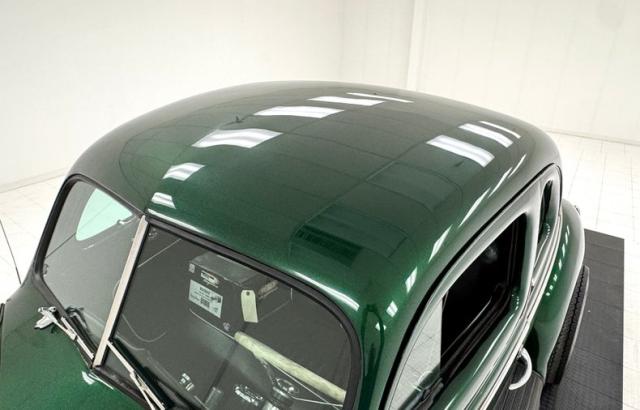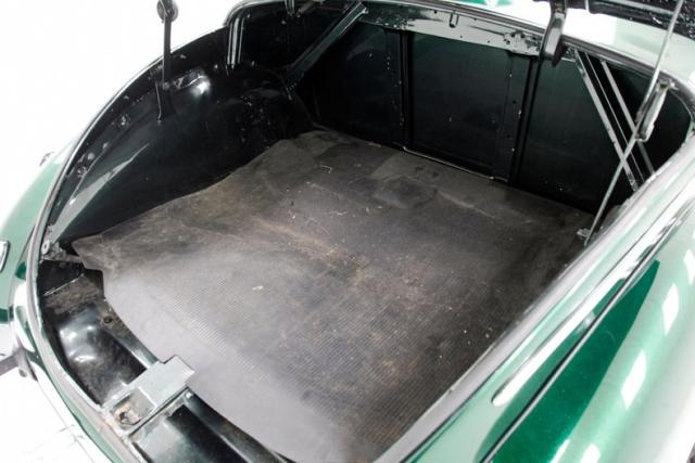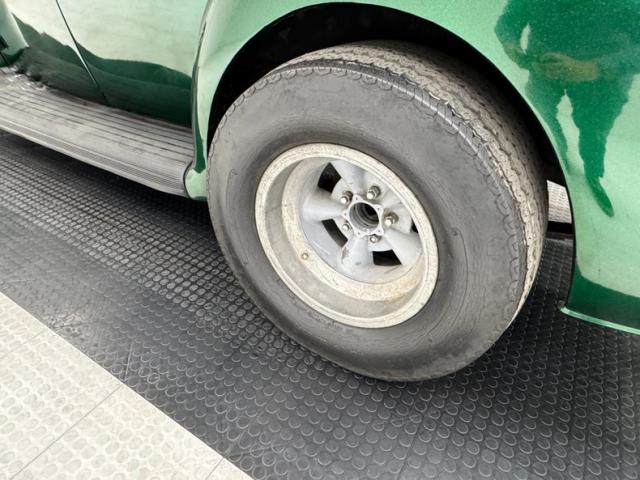 Bathed in Jade Green Metallic paint, we see straight slab steel panels, rounded front quarters, and a small running board connecting to a smaller rear fender. Rounded is the key word for the design of this car. From the front bumper to the rear bumper, we note nothing else but curvaceous curves. The backs of said bumpers have been darkened and now make an interesting reflection on the grille and front and rear fenders. It took me a while but \'tis the reflection of the back of the bumper in those grilles. A tall beaked hood floats above the vertical ribbed V curved grille, and dual side grilles flanking it. Headlights are embedded into the front fenders with large bezels that also house the high mounted signal markers. On the rear are shiny sergeant stripe bezels and lenses. A rounded trunk which is very spacious is very cleanly refinished with a rubber mat between the tail lighting. Rounded corner side windows and a rear oval window are noted to be cut onto the body and accentuate the rounded body lines. 14 and 15-inch Torque Thrust wheels with chipped black paint are on the front and rear respectively. These are wrapped by 205/70R14\'s in front, and larger N50-15\'s on back.