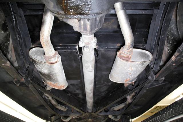 All very clean and rust free with a solid drilled X frame supporting the car with ease. Floor pans and rockers are excellent as are toe kicks and inner fenders. A solid axle and transverse leaf spring suspension in front and a leaf spring rear suspension are seen, as are disc brakes upfront and drum brakes on back. A clean and dual exhaust system with Turbo mufflers snakes its way from the engine to the X frame crossover where it continues on to end in chrome tips under the rear bumper.