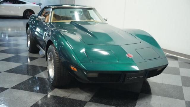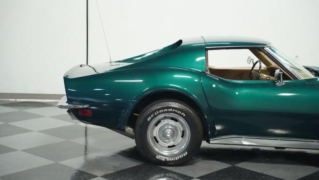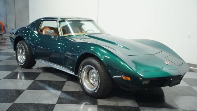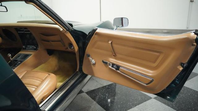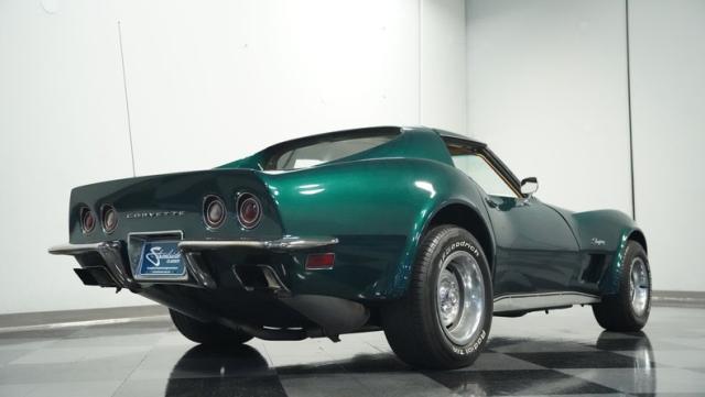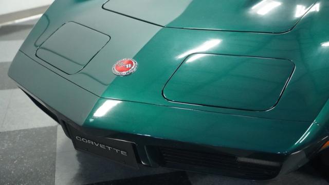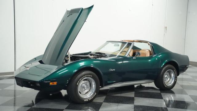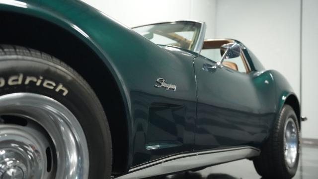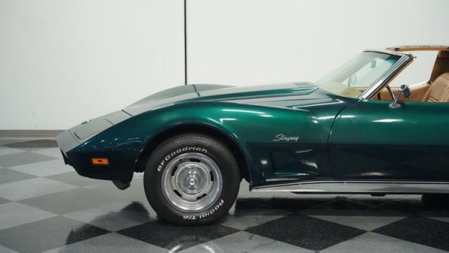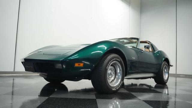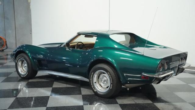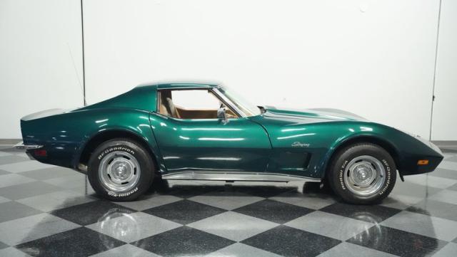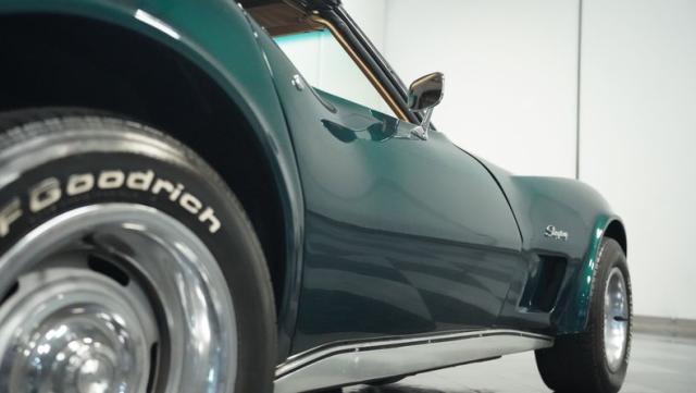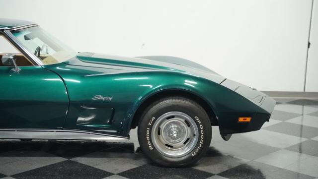 This 1973 Chevrolet Corvette sports a bold Emerald Green finish that accentuates its iconic curves. The aggressive stance is set by 15-inch wheels wrapped in beefy 245/60R15 tires, ready to grip the asphalt. Chrome accents highlight the sculpted body lines, contrasting beautifully with the green paintwork. The distinctive T-top roof design offers versatility, allowing for both enclosed comfort and open-air excitement. The color-matched front end flows seamlessly into the sleek profile, while the chrome rear bumper adds a classic touch to the tail end.