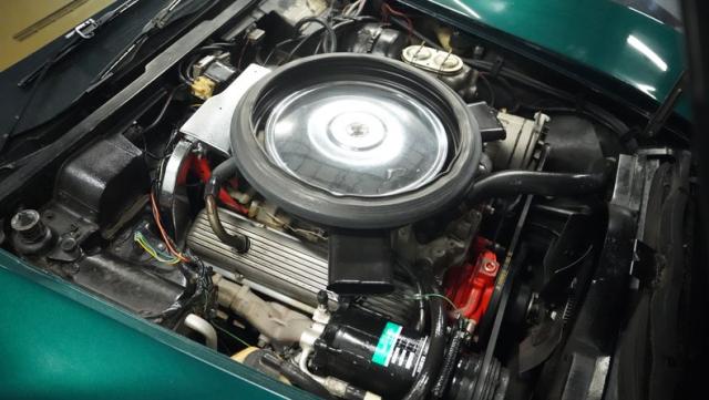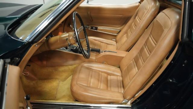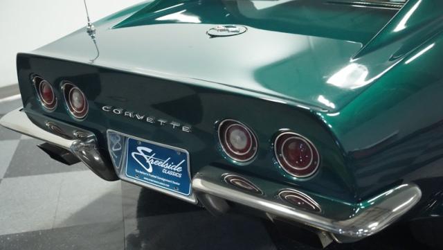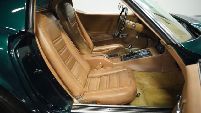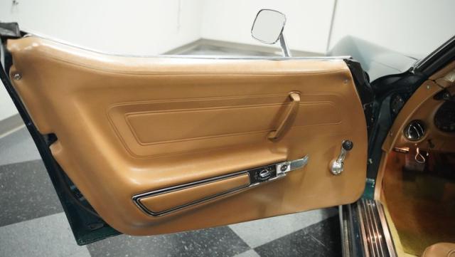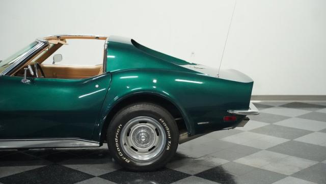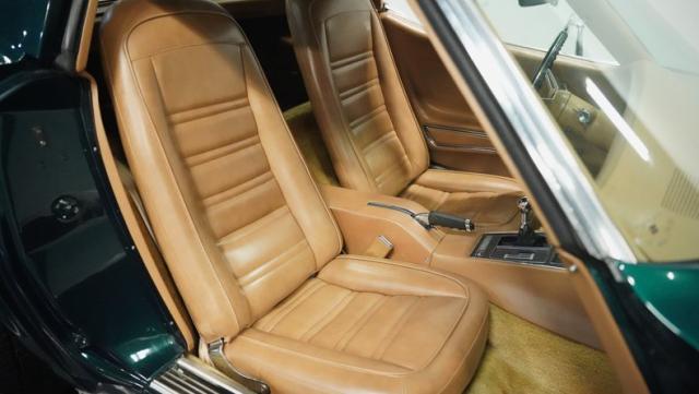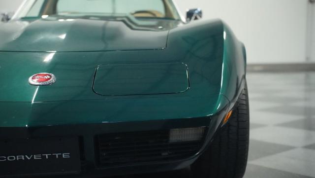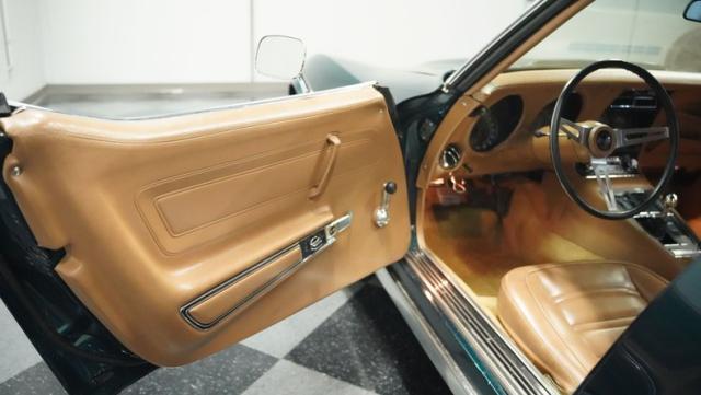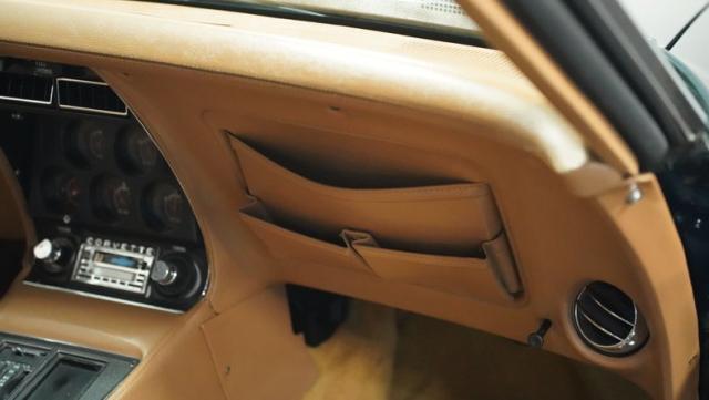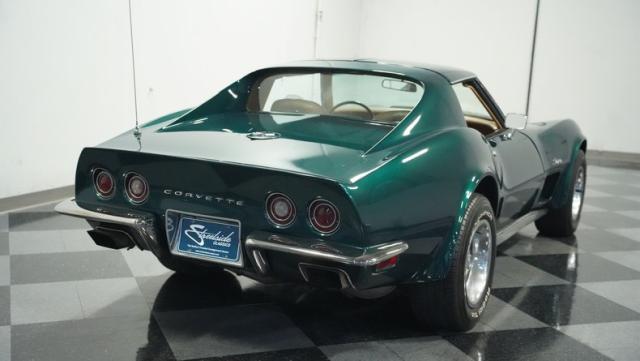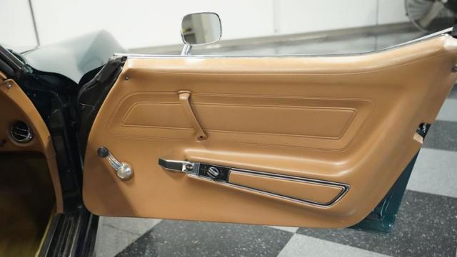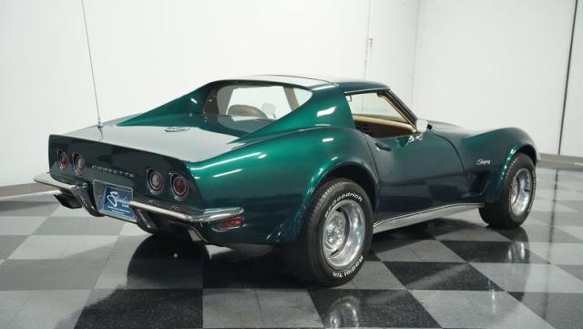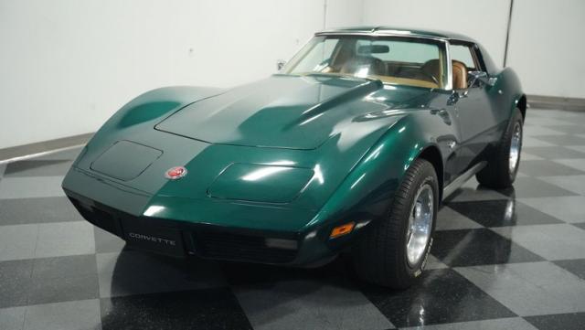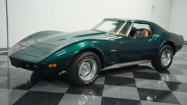 This 1973 Chevrolet Corvette sports a bold Emerald Green finish that accentuates its iconic curves. The aggressive stance is set by 15-inch wheels wrapped in beefy 245/60R15 tires, ready to grip the asphalt. Chrome accents highlight the sculpted body lines, contrasting beautifully with the green paintwork. The distinctive T-top roof design offers versatility, allowing for both enclosed comfort and open-air excitement. The color-matched front end flows seamlessly into the sleek profile, while the chrome rear bumper adds a classic touch to the tail end.
