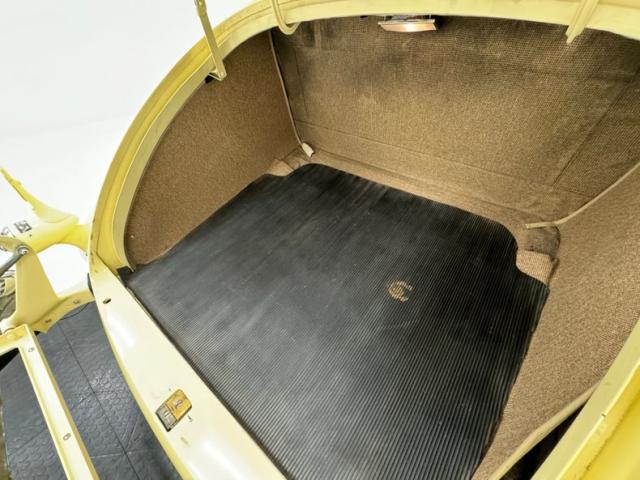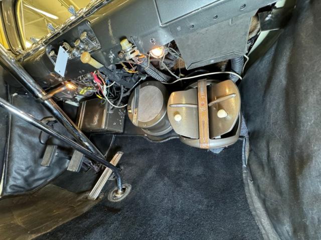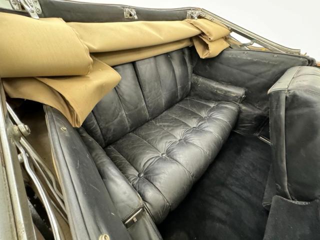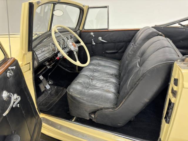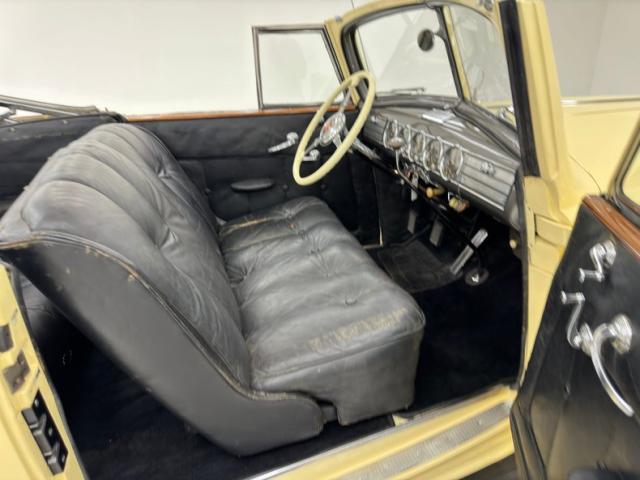 The upholstery was redone before our consignor took possession and is showing some age. Black leather is buttoned and pleated on the door panels topped by a wood header and retaining leather wrapped armrests. The tufted front split bench seat, along with the rear split bench, side walls, and armrests all show wear in the leather has some wear, contrasting with the exterior. Even with the patina, it\'s not difficult to imagine the opulence this would have represented in 1938. The ivory colored banjo style steering wheel is in decent condition with some minor cracking while the gray painted dash is in fine shape, housing a row of four large gauges with deco inspired font and design. Metal and ivory knobs provide the controls on the dash and a long shifter rises from the floor which is covered in plush black carpet. Tweed covers the inside of the trunk lid and walls while a rubber mat protects the floor of the lighted space.