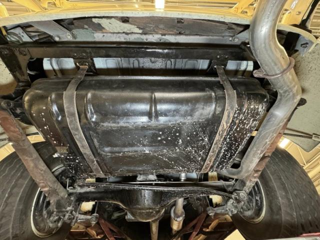 An X-frame and an enormous oil pan highlight an underside that is clean but driver quality. There\'s a bit of surface rust on the leaf springs in back, some residual oil on the transmission and on the rear differential as well. Our consignor states the exhaust system was replaced two years ago and consists of a single pipe, stock style muffler, and a tailpipe that exits under the rear bumper. The front suspension is independent and houses coil springs.