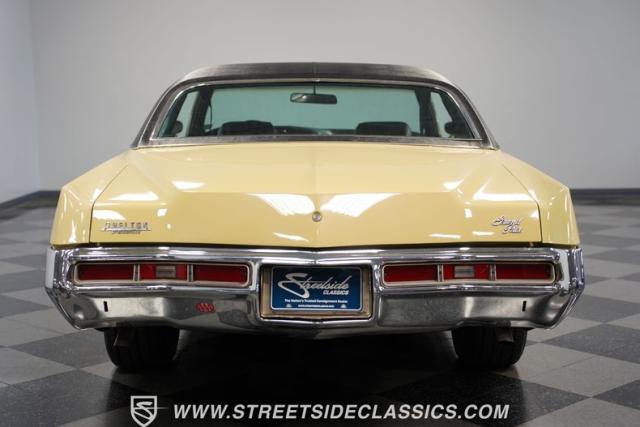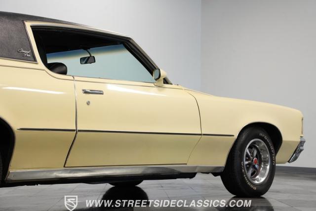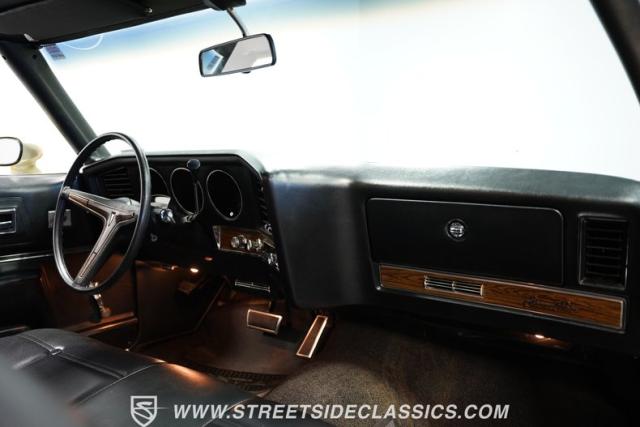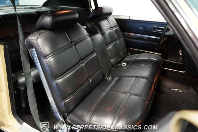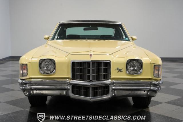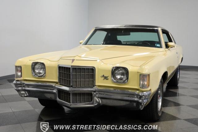 This 1972 Pontiac Grand Prix flaunts a bold yellow exterior that makes a solid first impression. Black accents, including a vinyl top and pinstripe, create a striking contrast against the bright body color. The \'72 model year stands out with its unique bumper design, integrating seamlessly with the muscular sheet metal. Riding on 15\" PMD wheels, this Grand Prix rolls on BFGoodrich Radial T/A tires sized at 225/60R15 all around. Dual exhaust tips peek out from the rear, adding a performance-oriented touch to the classic silhouette. Grand Prix badging and distinctive exterior door handles complete the look, emphasizing the car\'s identity as a luxury muscle machine.