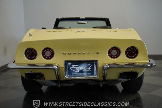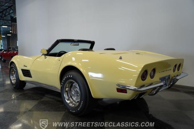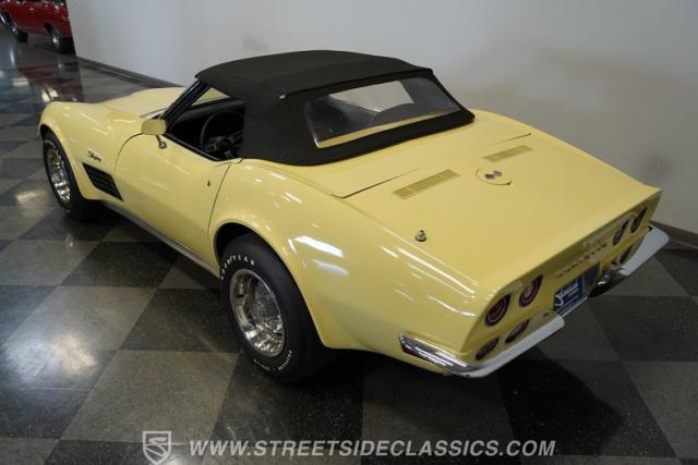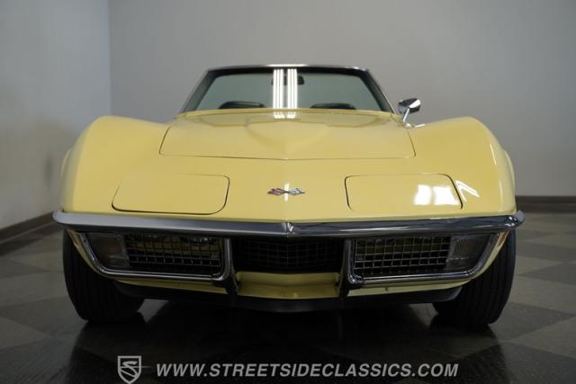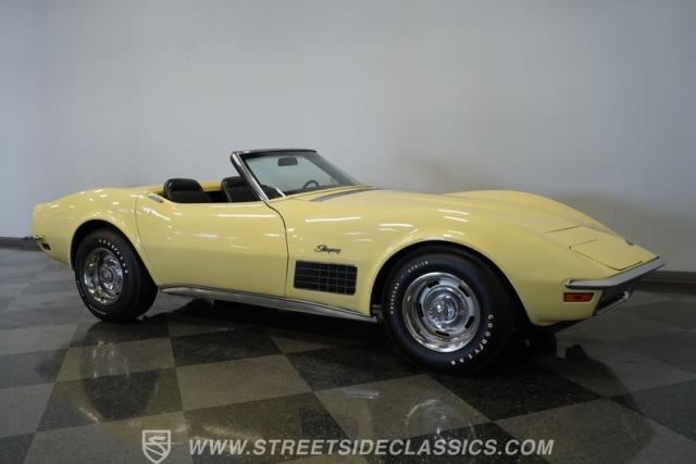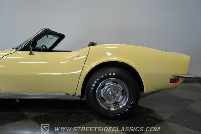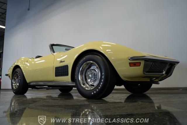 This numbers-matching 1970 Chevrolet Corvette Convertible in Yellow is a shining example of American muscle. With its shiny yellow paint glistening under the sun and the black vinyl convertible top providing a beautiful contrast, this classic ride oozes style from every angle. The sleek lines flow seamlessly from the pointed nose to the distinctive Corvette rear, accentuated by the chrome bumpers and trim. Rally wheels wrapped in G-70 Goodyear Polyglas tires provide just the right vintage look, while the optional factory painted removable hardtop adds to this Corvette\'s desirability.