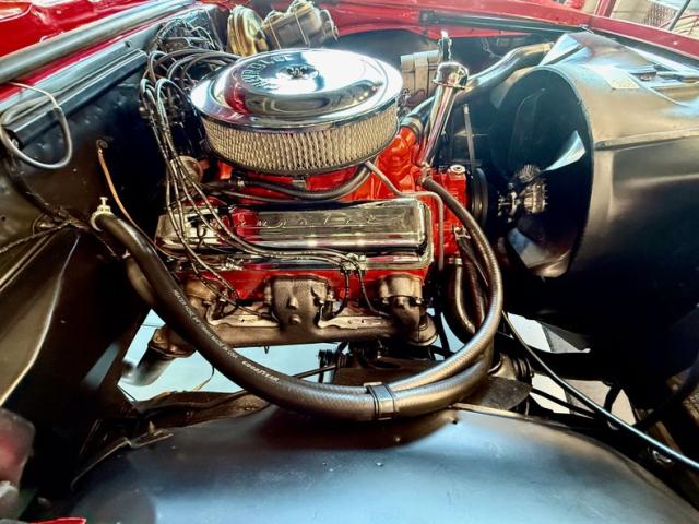 The car received a single-stage repaint in the factory shade of Bolero Red® reportedly following the installation of replacement quarter panels and front doors. The Super Sport package added non-functional hood vents, nose striping, and exterior badging on the fenders, grill, and fuel cap, while the Rally Sport package included vacuum-operated headlight covers, lower side moldings, and black trim. A rear fender-mounted antenna and remote-operated driver\'s side-view mirror are fitted with Ceramic coating. Silver-finished 14\" Rally wheels wear polished trim rings and hubcaps and are mounted with Firestone Redline tires. A full-size spare tire is located the trunk.