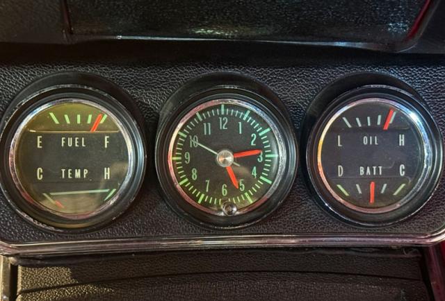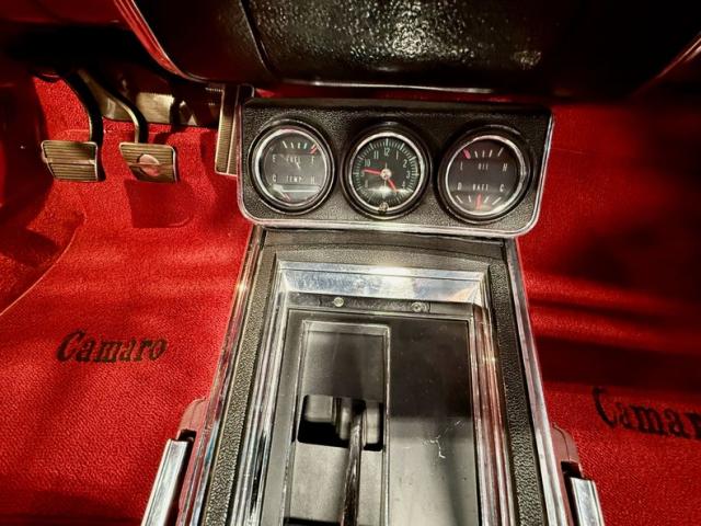 The interior features front bucket seats and a rear bench trimmed in red vinyl with black accents. A matching replacement dashboard, door panels, and loop carpets are protected by Camaro-branded floor mats. The car was optioned with a factory center console, and additional amenities include lap belts for all occupants, a push-button AM/FM radio, and a locking glovebox. A wood-rimmed three-spoke steering wheel is mounted to a tilt steering column and frames a 120-mph speedometer and a 7,000-rpm tachometer. A trio of auxiliary instrumentation is situated in the center console, featuring an analog clock and auxiliary gauges. The five-digit odometer was reset to zero during the refurbishment and currently indicates 7,000 miles. The total mileage remains unknown. The engine block stamping 117014, as displayed above corresponds to the final six digits of the chassis number visible in the gallery below. The MU suffix to the right signifies a 350ci 295 horsepower V8 engine designed for automatic transmission applications. A custom 3-inch exhaust system has been installed.
