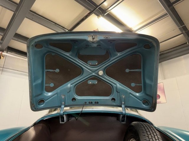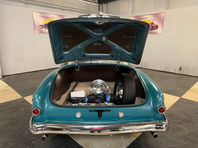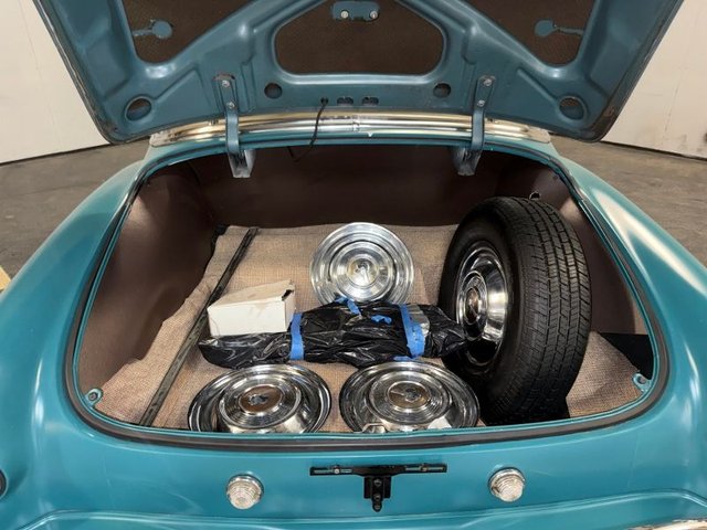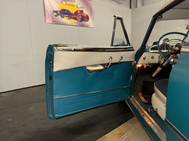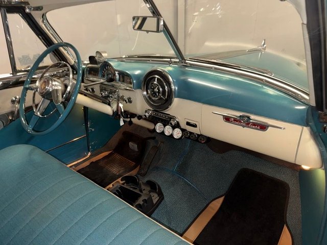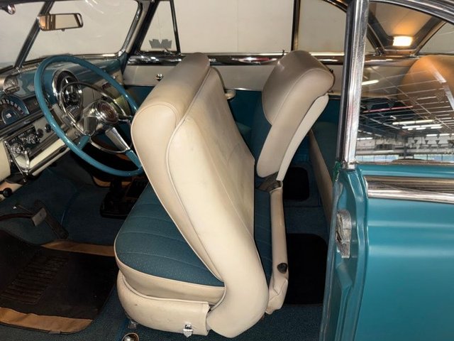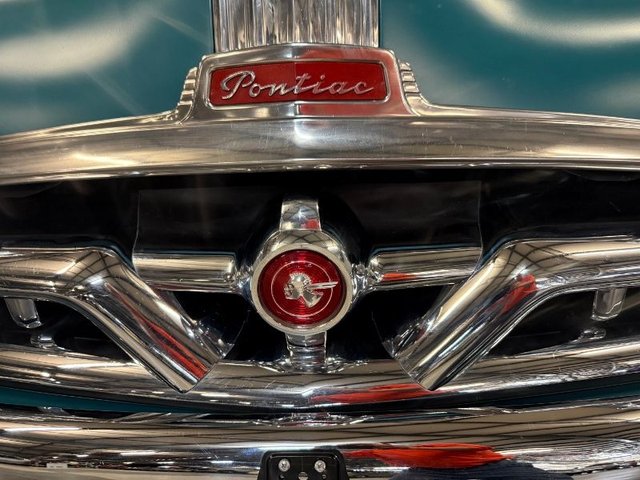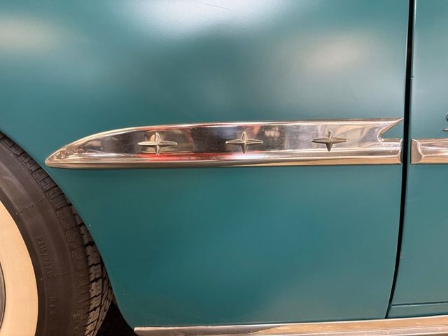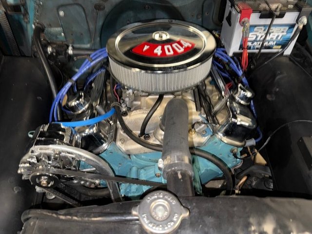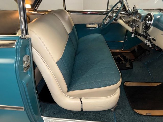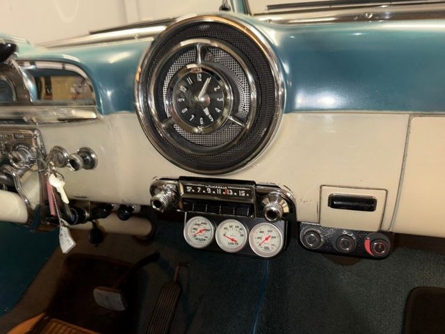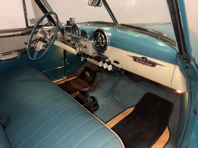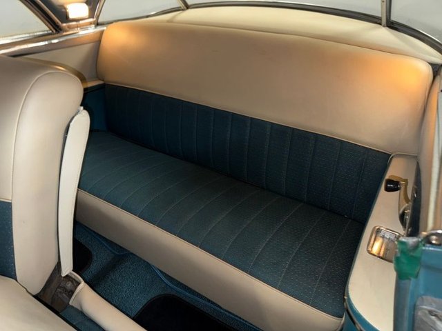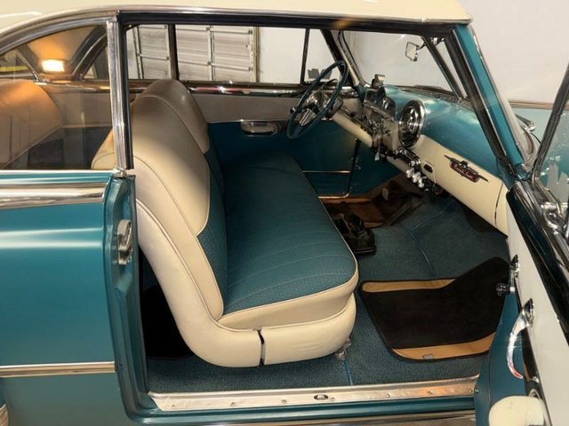 The interior is Teal cloth with cream vinyl on a bench seat. Door panels and dash are teal and cream. Factory gauge cluster is chrome with Battery-Fuel-Speedometer-Oil -Water. Factory clock and chrome trim. Factory AM radio, all chrome has factory dash knobs, chrome emergency brake is factory. Factory steering wheel with chrome horn ring, factory Pontiac button with Indian, door handles and window cranks are newer. Automatic on factory column. 3-gauge cluster is aftermarket under the dash; Water-Volts-Oil. Cream vinyl headliner with chrome stripes, cream Sunvisor’s, cream package tray. The carpet is Teal, black and white floor mats. Chrome rearview mirror. Deluxe traffic light viewer. All looks great inside!