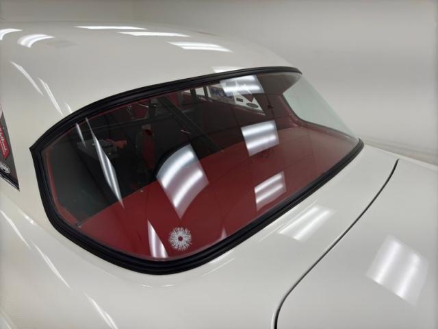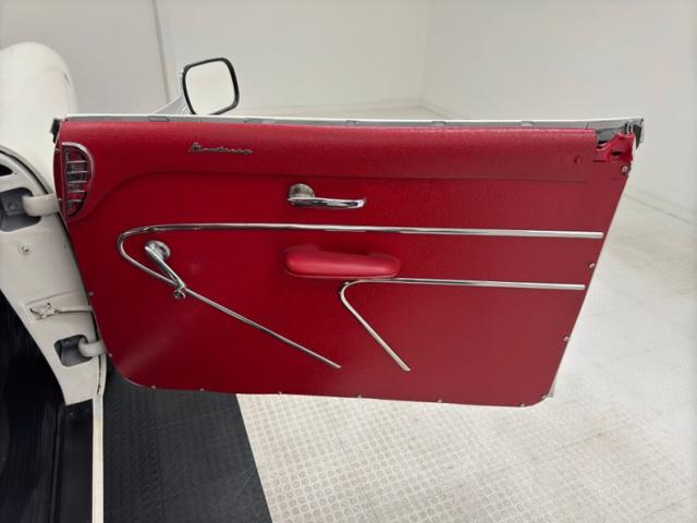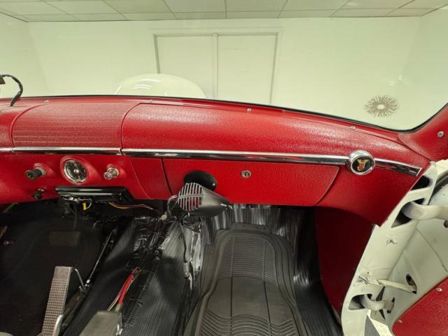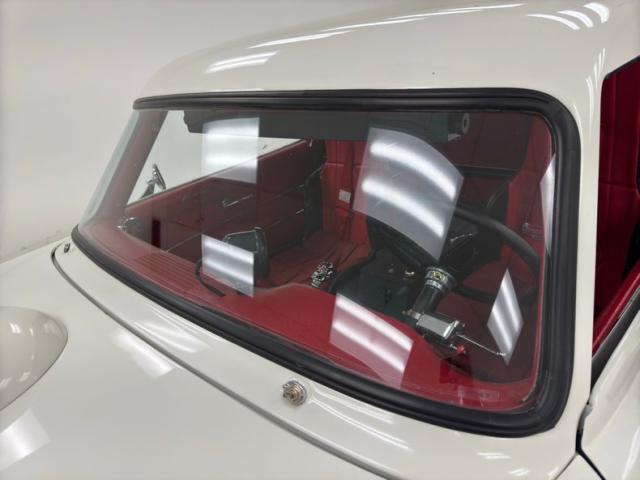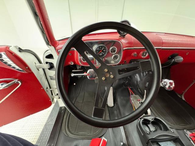 Looking very snazzy in the freshly painted black engine bay, a red block and valve covered 283ci V8 now resides. It specs out as a 1964 version and on top is an Edelbrock intake and 4-barrel carb. On the back is a 2-speed automatic Powerglide automatic transmission. Headers are on, and these melt into the aforementioned straight pipe. A Ford 9 inch rear axle smokes the tires.