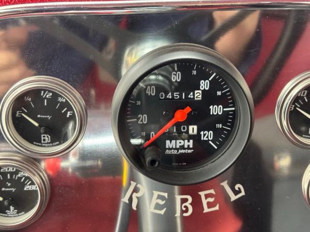 Near perfect door panels have smooth red vinyl and some lazy chevrons in shiny chrome trimming them, as well as shiny actuators, cranks and an armrest. Pure racing buckets in straight back form sit on some tube stock stilts which float upon a rubber floor. In the center is a big black metal console with a few levers, a push button and a toggle. A lock box is on the top tier of this console. The back seat has been removed and now a rubber mat covers the floors. In the center is a B&M shifter with a skull topper. The dash has the underpinnings of the original Merc dash, nicely rounded over and all steel but has been painted with red texture paint. In front of the driver there is a custom shiny polished aluminum dash front panel housing various modern black faced gauges and a REBEL etched badge in the center. A tachometer is on the dash top and a black rally steering wheel is fronting the dash. Also noted is an aftermarket AM/FM/CD radio. Above a smooth red vinyl headliner is in.