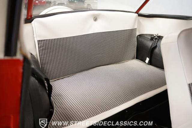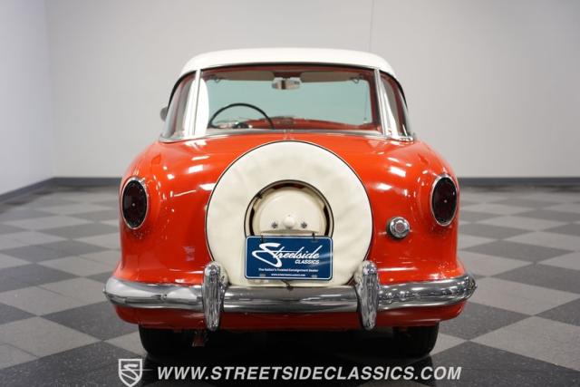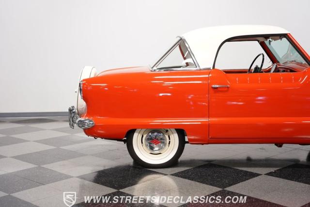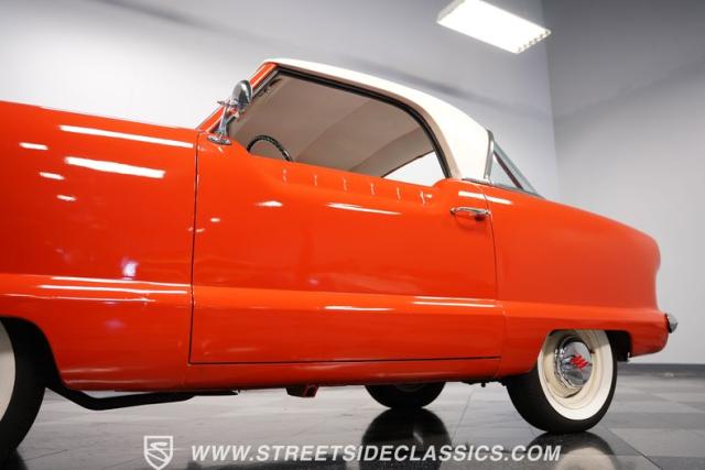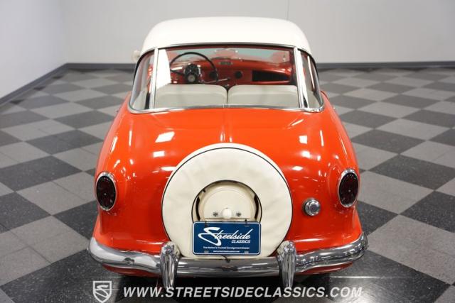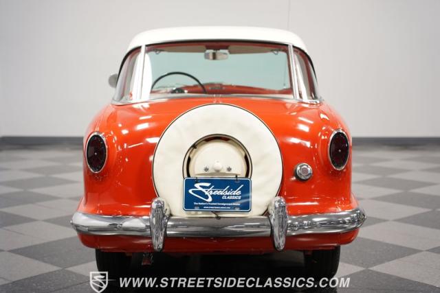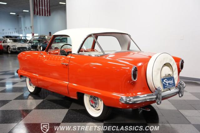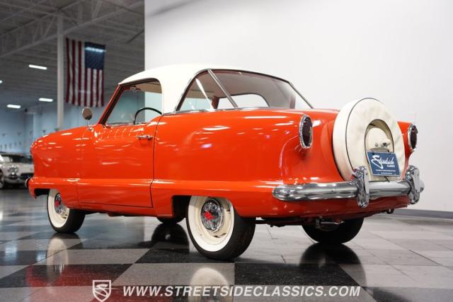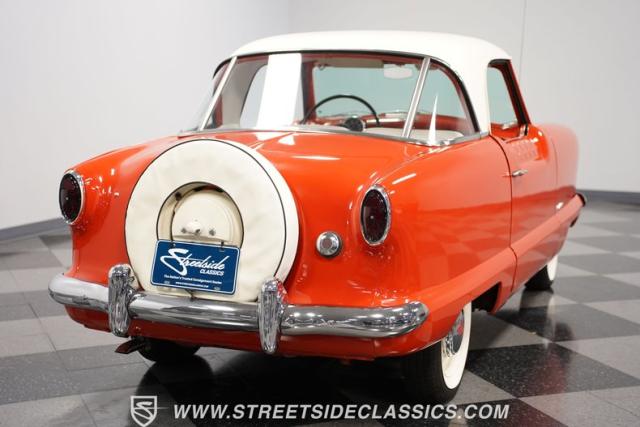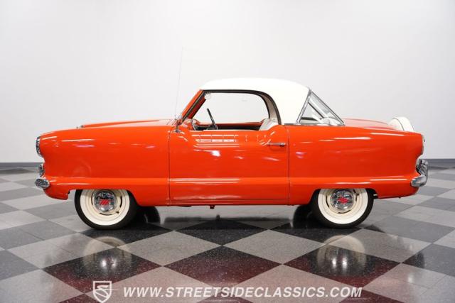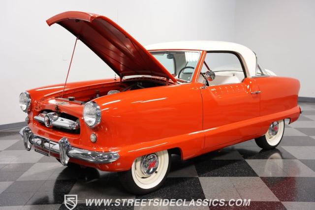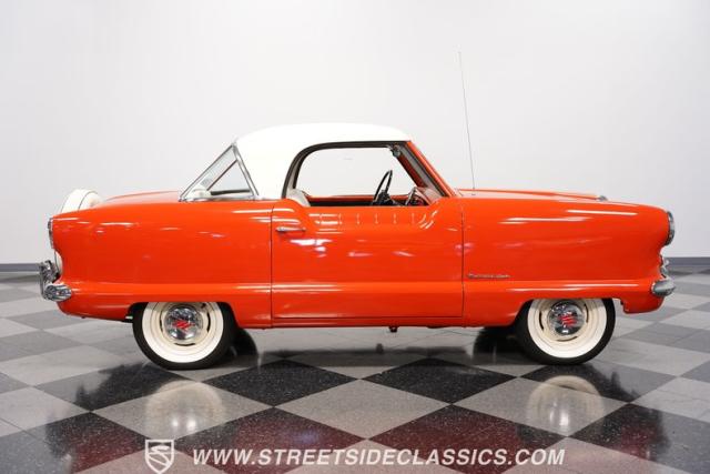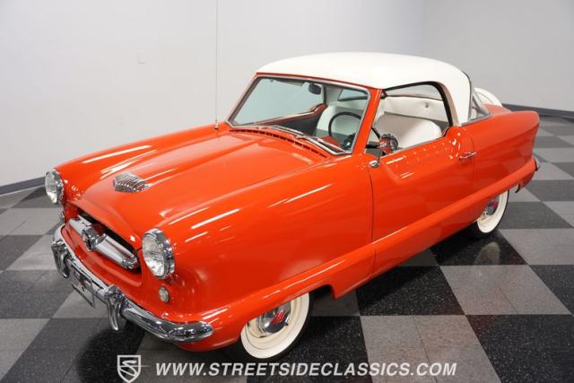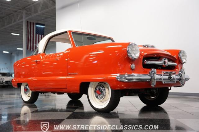 The 1955 Nash Metropolitan is an iconic example of American automotive design, notable for being one of the first American-designed cars that focused on compactness and fuel efficiency, a concept ahead of its time. This particular model, with its two-tone Canyon Red and White paint job, exhibits a playful yet classic 1950s aesthetic. It has undergone a full repaint that suits the car\'s distinctive styling.