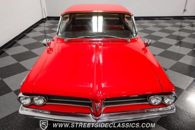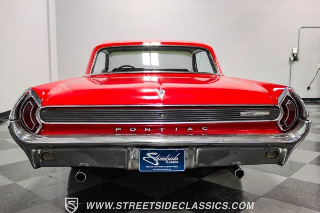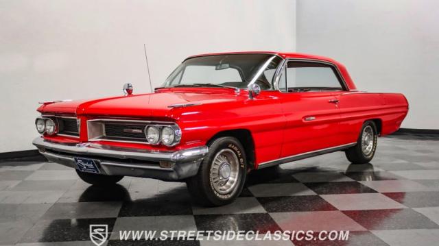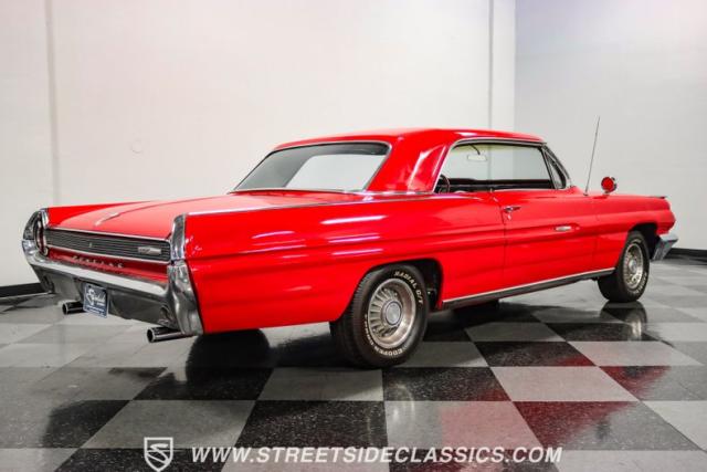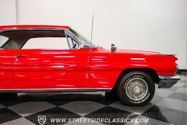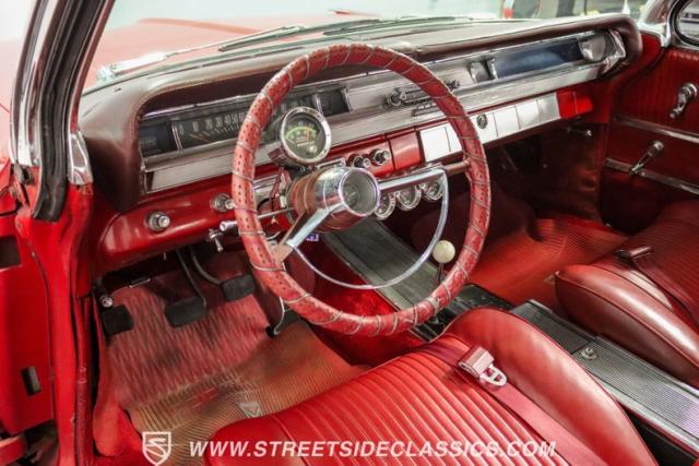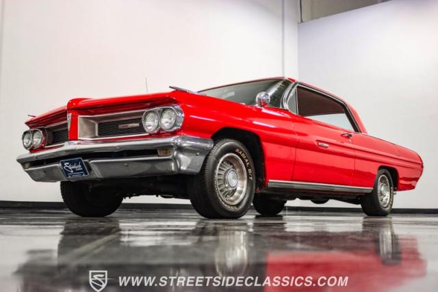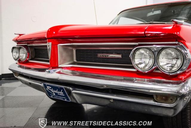 This 1962 Pontiac Grand Prix dressed in Mandalay Red with its sleek lines and muscular stance pays homage to Pontiac\'s performance legacy. The distinctive split grille and stacked headlights make a bold first impression, while the 8-lug 14-inch wheels with 225/70R14 Cooper tires provide a period-correct stance. This Grand Prix\'s exterior is accentuated by chrome bumpers and fender ornaments that, while showing some age, contribute to its authentic vintage appeal.