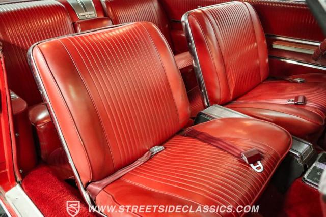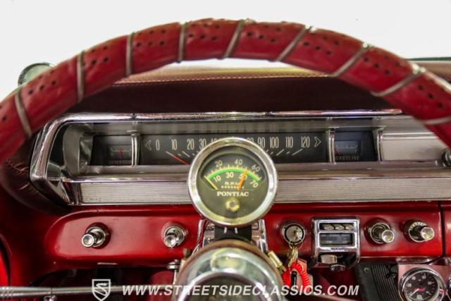 Inside, the red vinyl interior transports you back to the early \'60s. The bucket seats with a center console exemplify the Grand Prix\'s blend of luxury and sportiness. The dash retains its classic layout, complemented by a newer dash pad and additional under-dash gauges for more precise readings. A white vinyl headliner caps off the cabin, maintaining the car\'s period-correct ambiance. The wrapped steering wheel and column-mounted tachometer add a touch of customization to the otherwise stock interior.