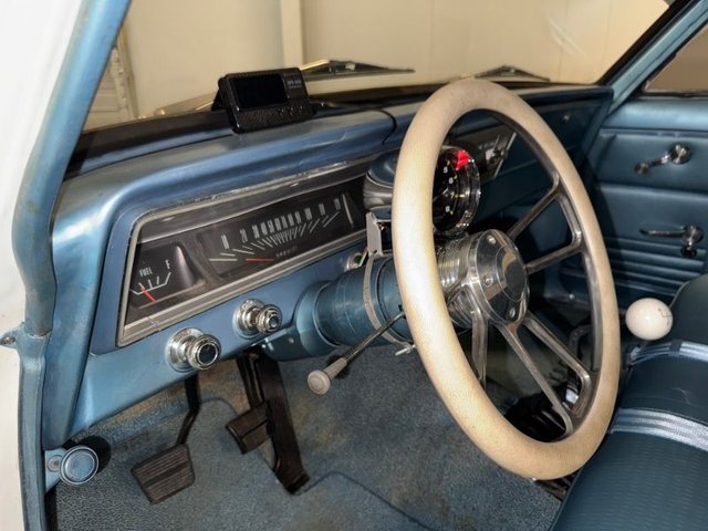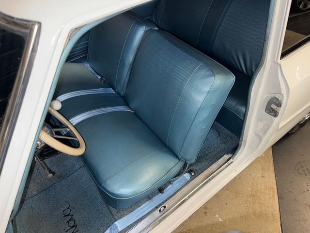 Light blue interior on a bench seat that looks good. The door and back panels are like new. Dash is painted light blue with factory cluster and speedometer and fuel gauge. Factory AM radio in dash. Bosch gauges temp-oil-volts on white face mounted in stainless cluster mounted under the dash. Auto gauge Tach black face, mounted on steering column. Billet Specialties half wrapped steering wheel in white leather. Hurst 4-speed shifter and boot new. Light Blue headliner is like new. Light Blue carpet with matching floor mats and Nova logo that look good. Kick panels are good. Door handles and window cranks and door locks like new. Light Blue seat belts are new. Door sill plates like new. Light blue package tray is like new. Carpeted trunk light blue. Spare tire-jack. Looks really nice inside.