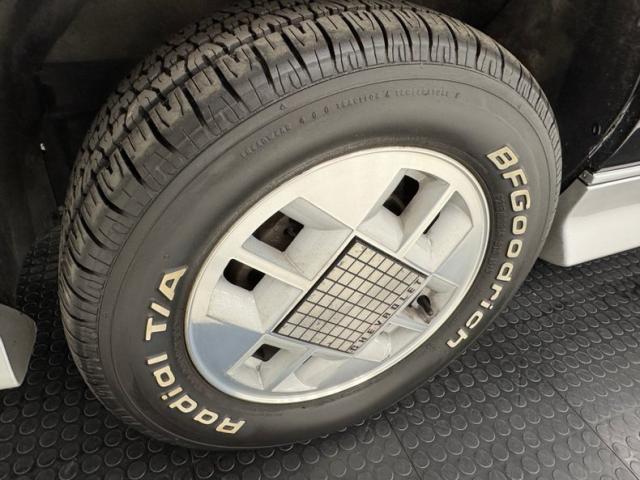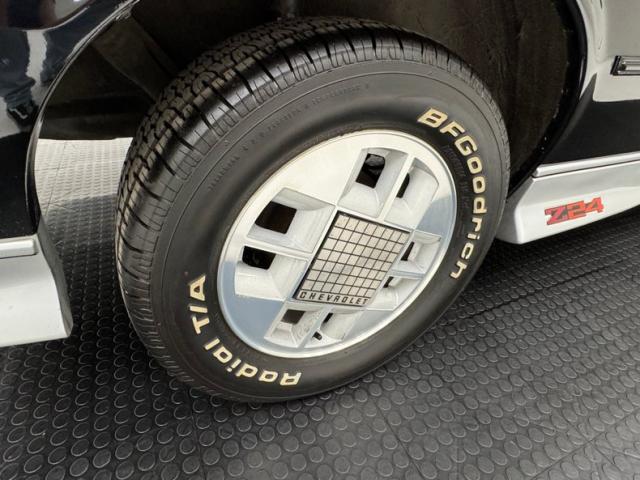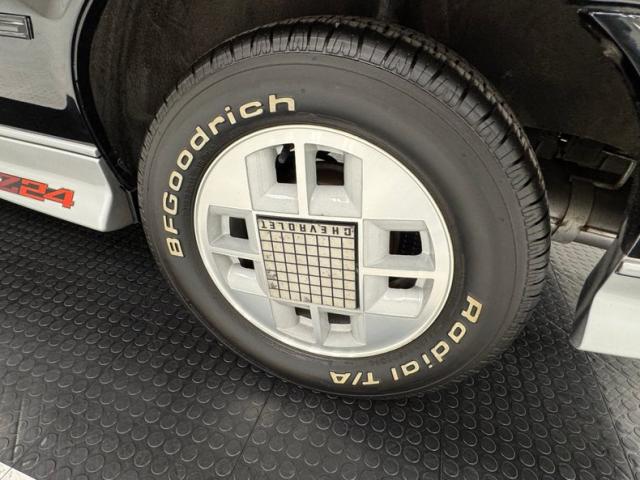 Two tone was also popular, especially at Chevrolet where performance models with body cladding were often subjected to a treatment of silver or gray to contrast with the body color, in this case black. Chevrolet was also not shy about using red plastic call outs evident here on the decklid, Z24 on the dogleg, and of course, the bowtie in front. Speaking of the front, Chevrolet adds some aggression the hood with a pair of power bulges, but no too aggressive while the rear deck sports a luggage rack for long distance adventures, but it\'s the unique, geometric wheels that set this car apart and make it iconically 80\'s and if you\'ve ever wondered what a square peg in a round hole would look like, look no further than the 14-inch refinished wheels that wear tires with a late 2023 date code. Imperfections here include rock chips on the front, a ding and touched up chip on the right fender, ding and scratch on the door, and typical chin scrapes. The black canvas top and plastic window are in great shape.