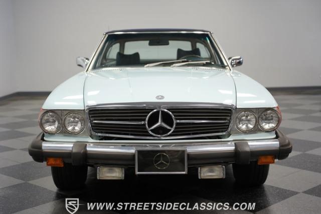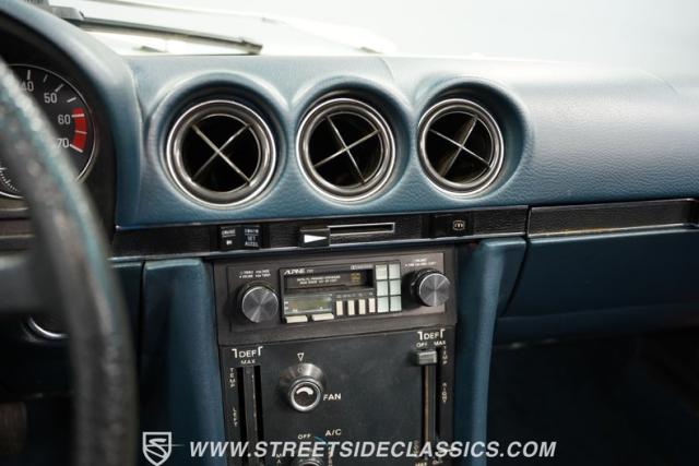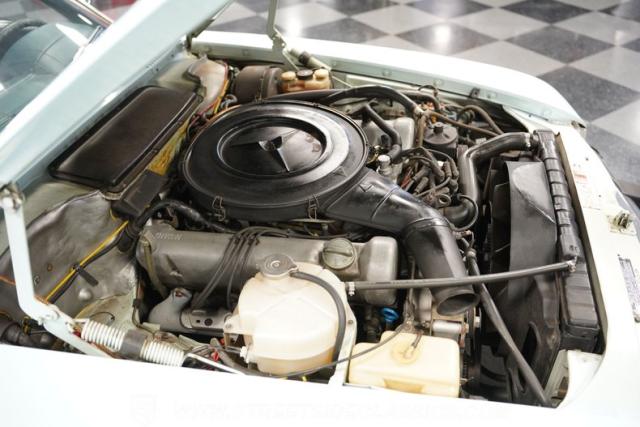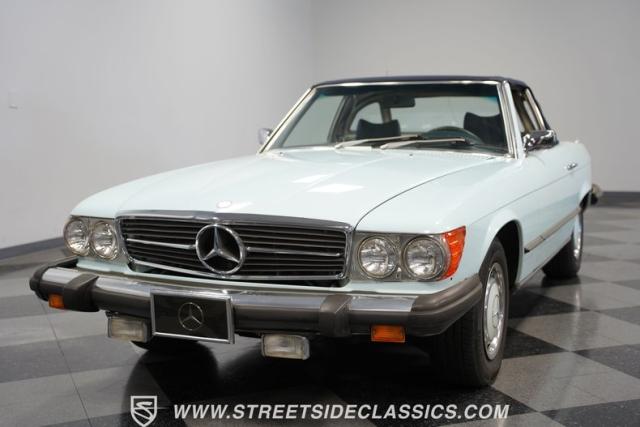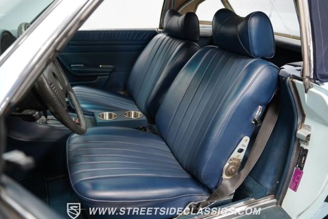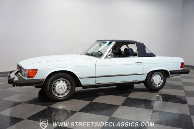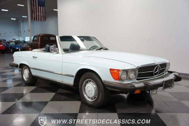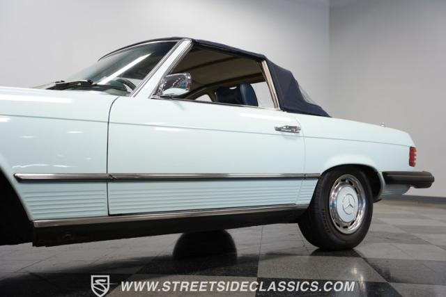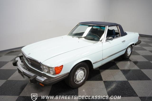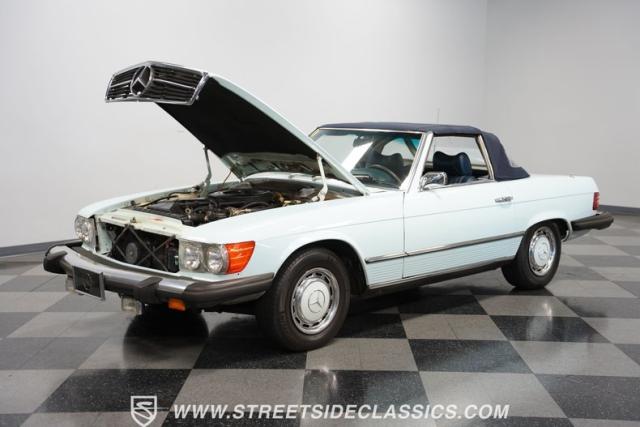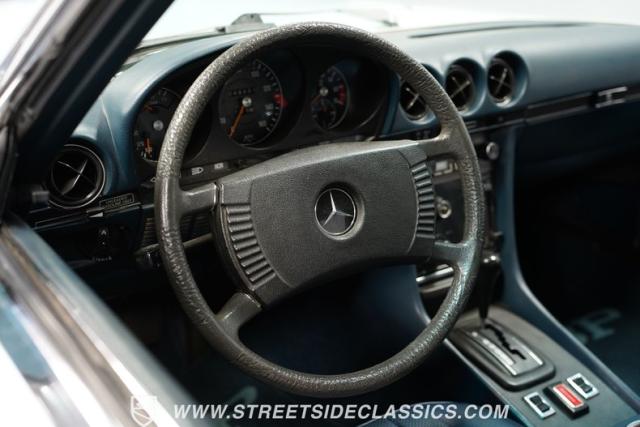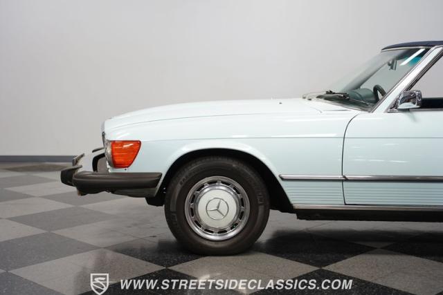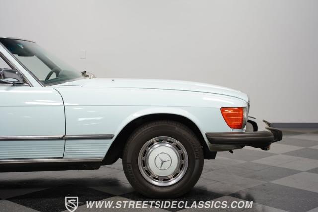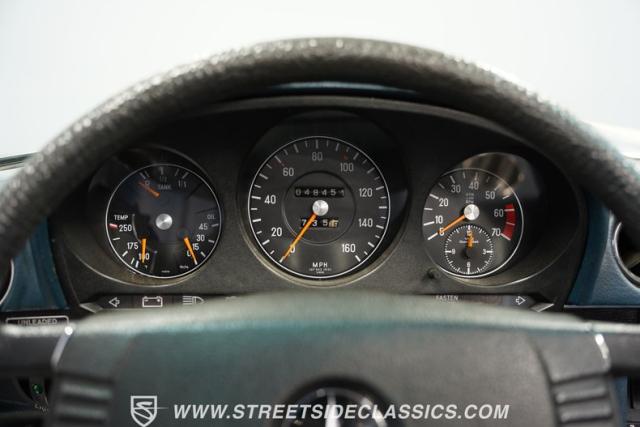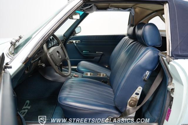 Coated in Aqua Blue paint, the 1975 Mercedes-Benz 450SL exudes a classic appeal that captures attention without effort. This model features a navy blue convertible top with a refined look and a vibrant body color. It rides on 14-inch wheels, fitted with 205/70R14 tires and adorned with color-matched wheel covers, enhancing its cohesive aesthetic. Additionally, the color-matched fiberglass top allows for versatile style changes, maintaining the sleek silhouette whether the top is up or down.