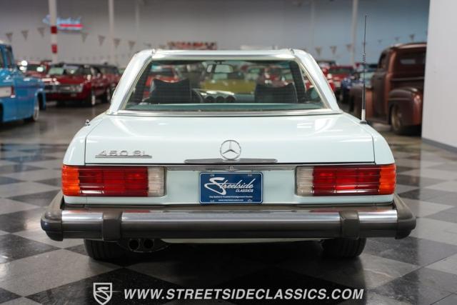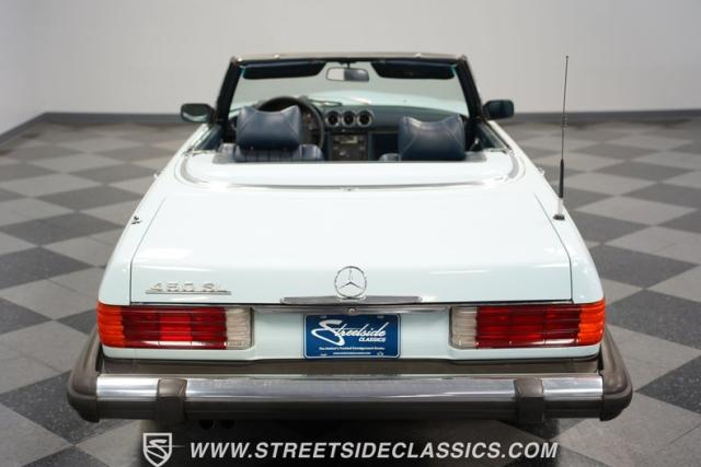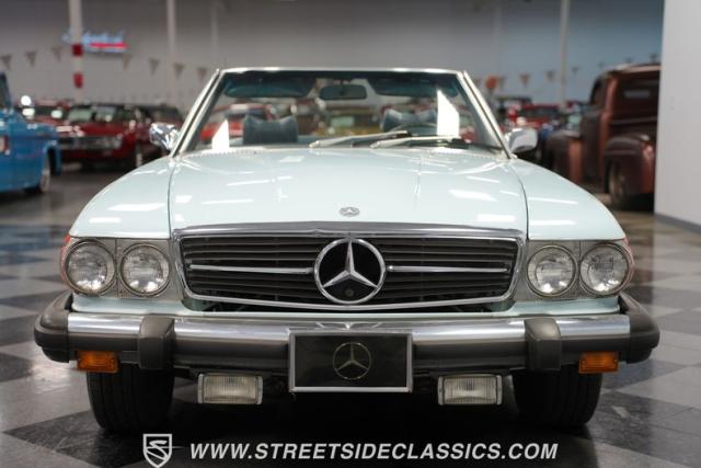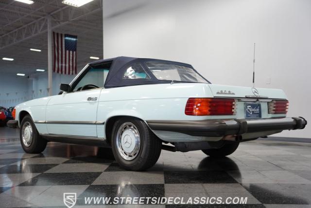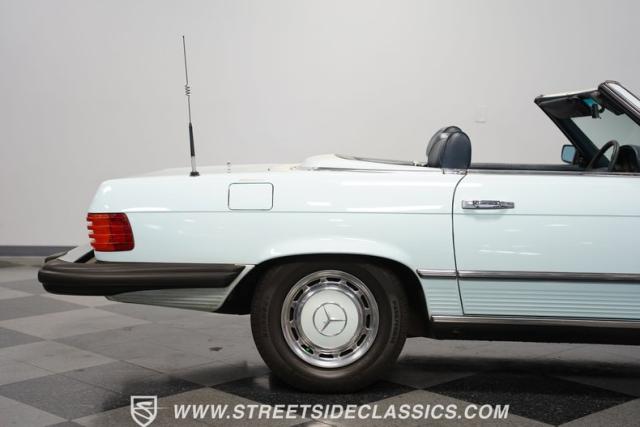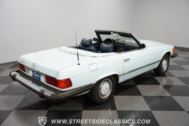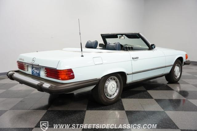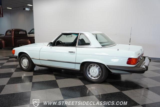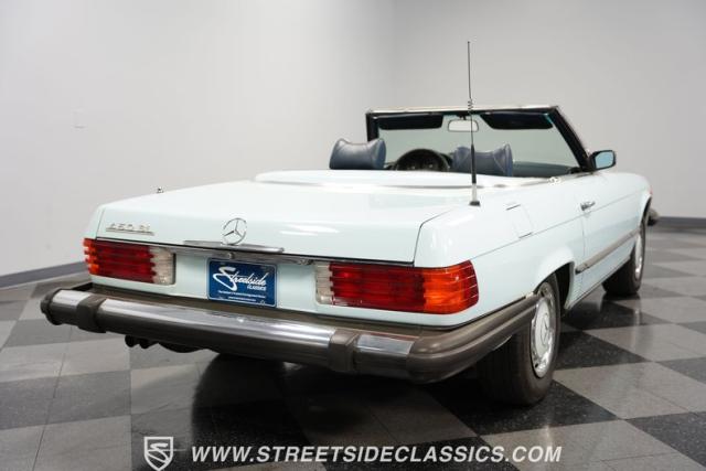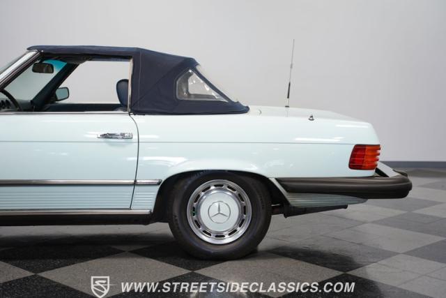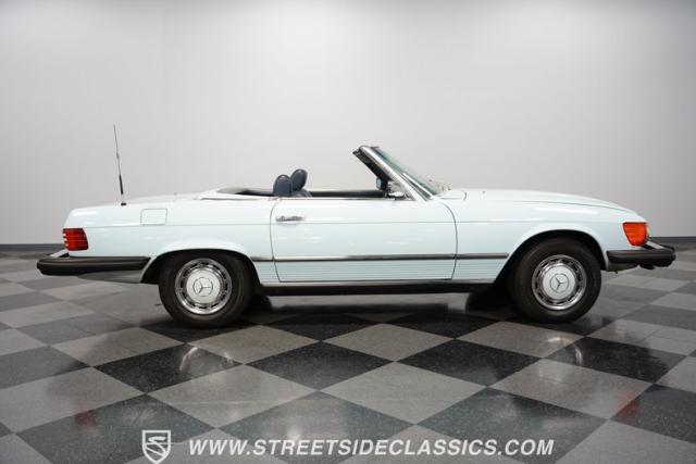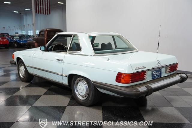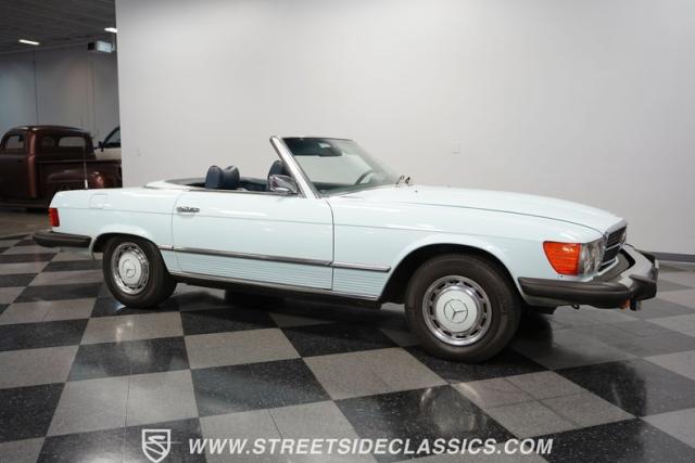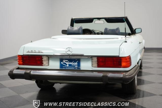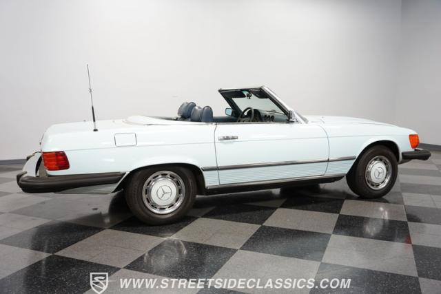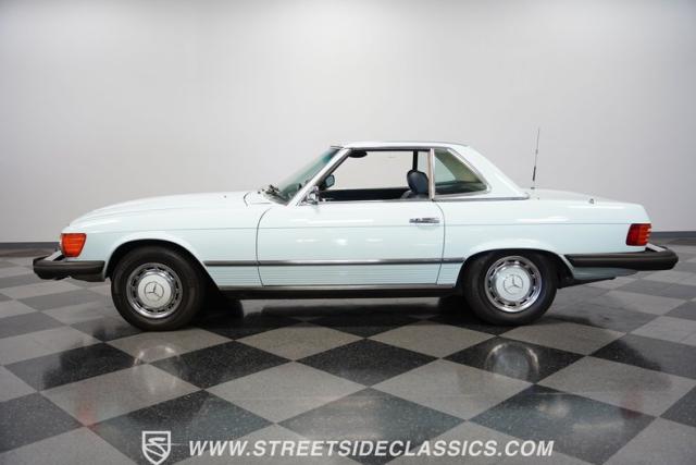 Coated in Aqua Blue paint, the 1975 Mercedes-Benz 450SL exudes a classic appeal that captures attention without effort. This model features a navy blue convertible top with a refined look and a vibrant body color. It rides on 14-inch wheels, fitted with 205/70R14 tires and adorned with color-matched wheel covers, enhancing its cohesive aesthetic. Additionally, the color-matched fiberglass top allows for versatile style changes, maintaining the sleek silhouette whether the top is up or down.