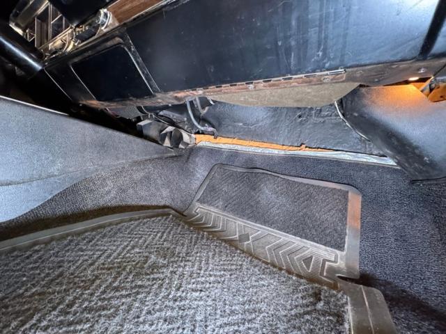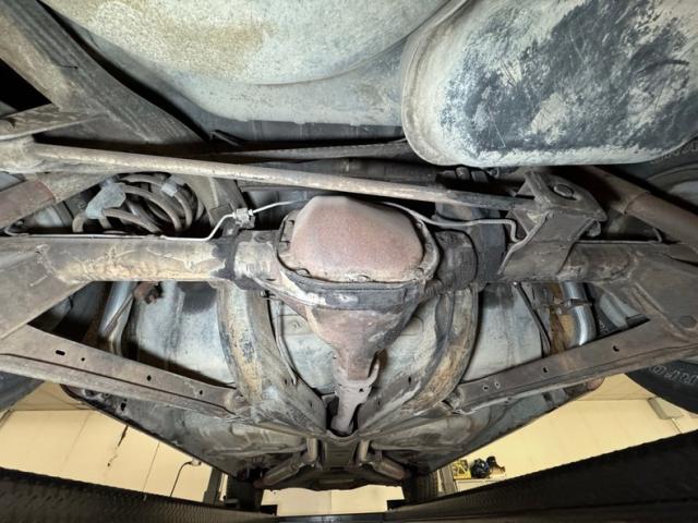 The underside has its share of surface rust and patina, but it\'s all there and sound in structure. Dual exhaust flows through glasspack style mufflers before finding their way to the back where they terminate behind the rear bumper. The pans are dry and so is the rear differential. Suspension is your basic coil springs up front and a 3 link with coil springs and panhard bar out back.