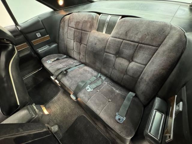 Black vinyl door panels are button tufted as was common in the era and these show some patina and could use a careful detail to bring them back to life. Cloth buckets with similar button tufting with the driver\'s showing some age but are in very good condition considering the soft texture of the velour, while the back bench and passenger seat are in great shape. A simple black steering wheel fronts a gauge cluster that is all squares, also period popular, and has a mid-panel that is adorned with woodgrain applique that surrounds several toggle switches and the climate panel. To the right, an AM radio with the imaginative feature of having BUICK spelled out on the five pushbuttons resides in its factory home. Although the woodgrain vinyl is peeling from the center console, the shift plate is chromed and arched and putting it into gear is akin to nose up in an airplane, pulling through the half circle until it clicks into D. Talk about party tricks and conversation pieces! Meanwhile, black loop carpet covers the floor, the stitch ribbed headliner is in nice condition, and the trunk shows usage and would benefit from some new finishing mats.