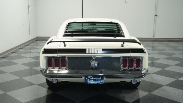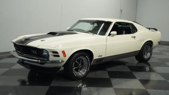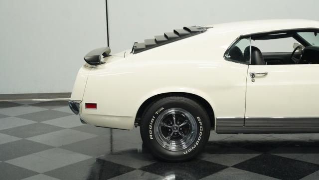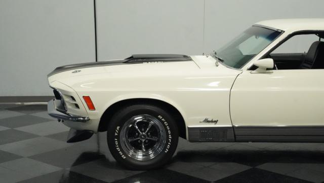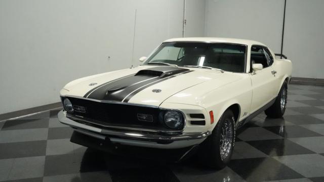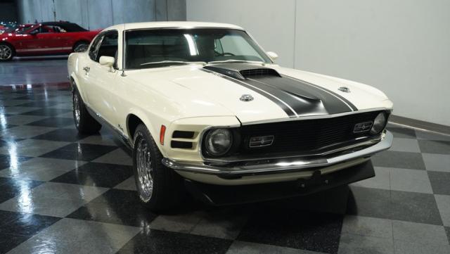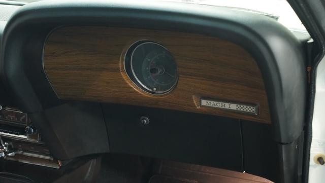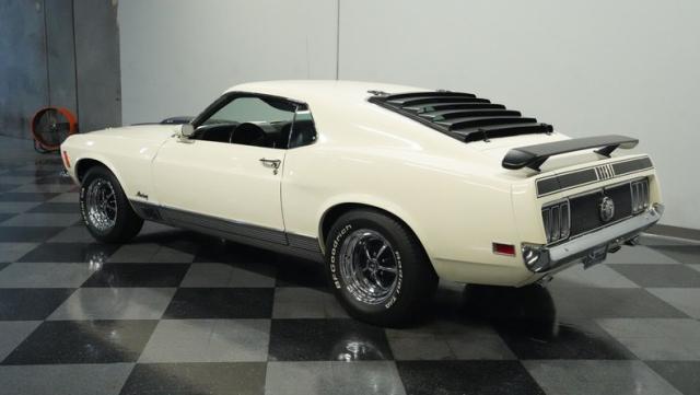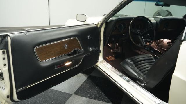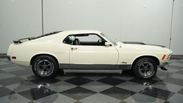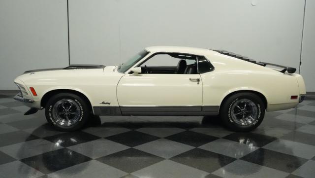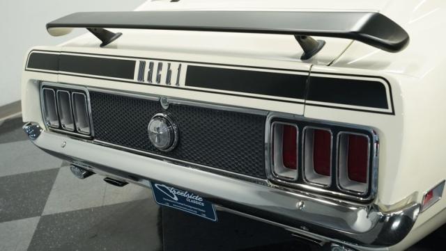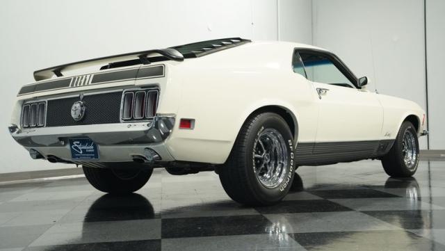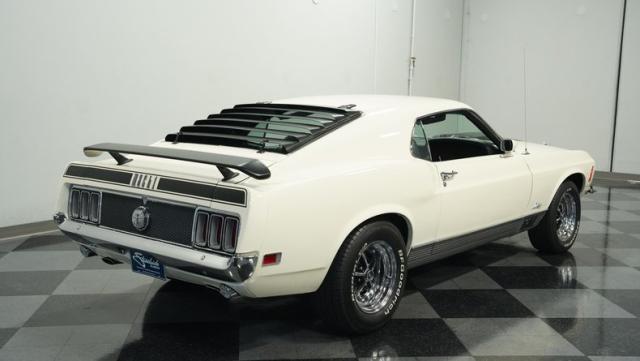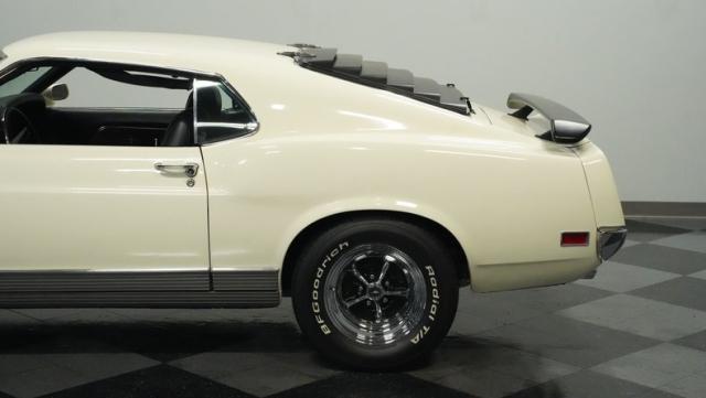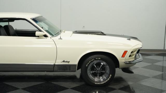 This 1970 Ford Mustang Mach 1 Q-Code is a true muscle car icon, draped in Wimbledon White with bold black stripes that accentuate its aggressive fastback profile. Built on November 5, 1969, this pony car sports an agressive look , showcasing its performance pedigree. The exterior is further enhanced by chrome bumpers and trim that gleam against the pristine paint. Rolling on 15-inch wheels wrapped in meaty 225/60R15 front and 255/60R15 rear tires, this Mach 1 exudes power and style from every angle.