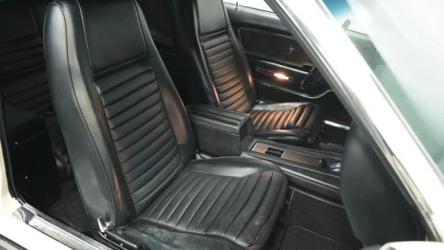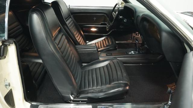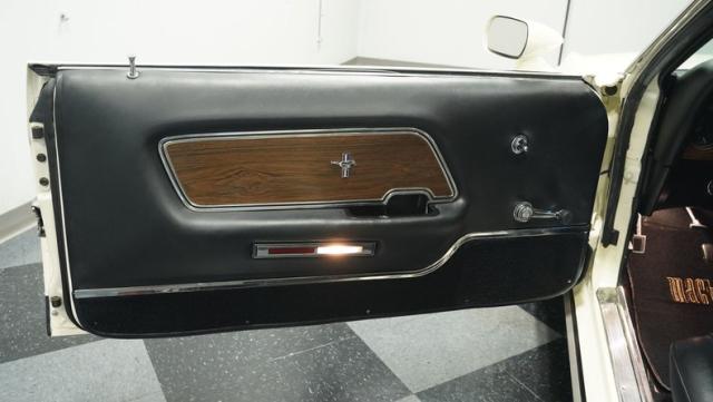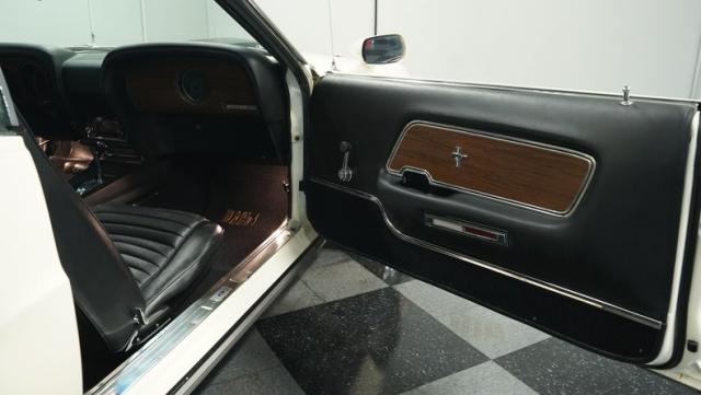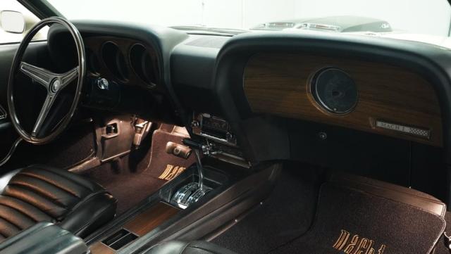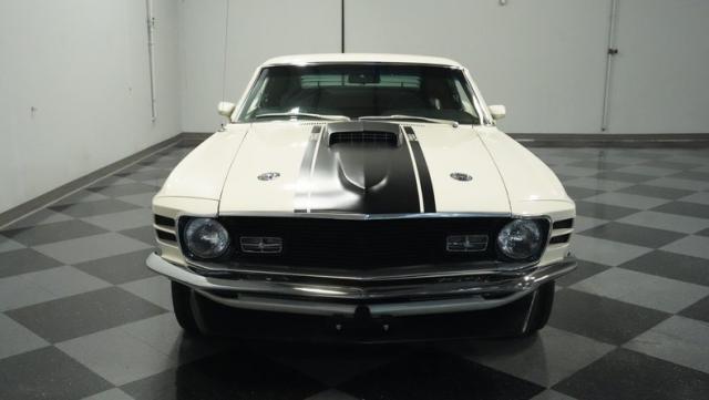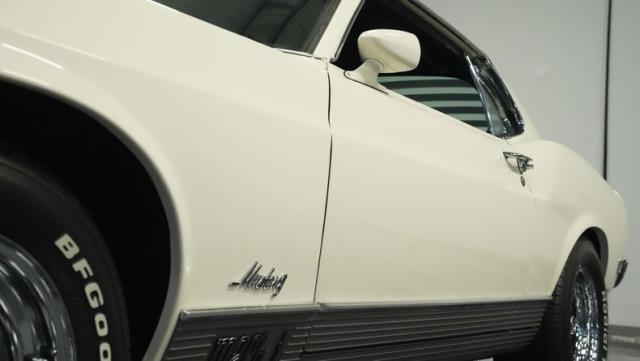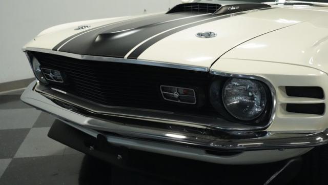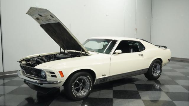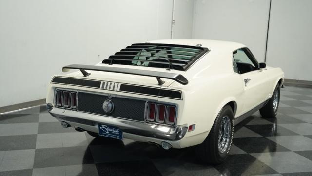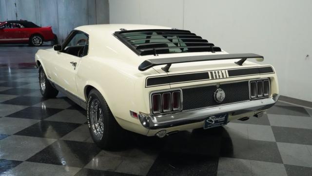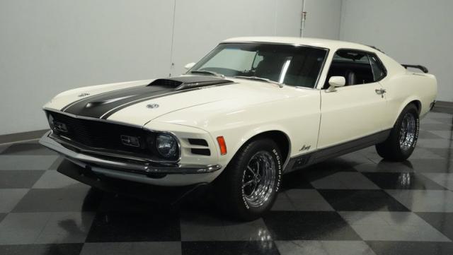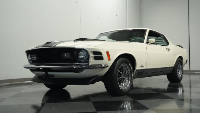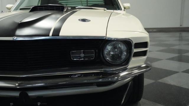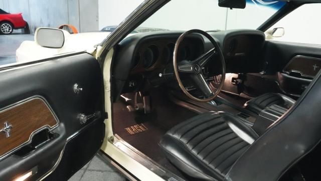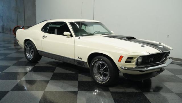 This 1970 Ford Mustang Mach 1 Q-Code is a true muscle car icon, draped in Wimbledon White with bold black stripes that accentuate its aggressive fastback profile. Built on November 5, 1969, this pony car sports an agressive look , showcasing its performance pedigree. The exterior is further enhanced by chrome bumpers and trim that gleam against the pristine paint. Rolling on 15-inch wheels wrapped in meaty 225/60R15 front and 255/60R15 rear tires, this Mach 1 exudes power and style from every angle.