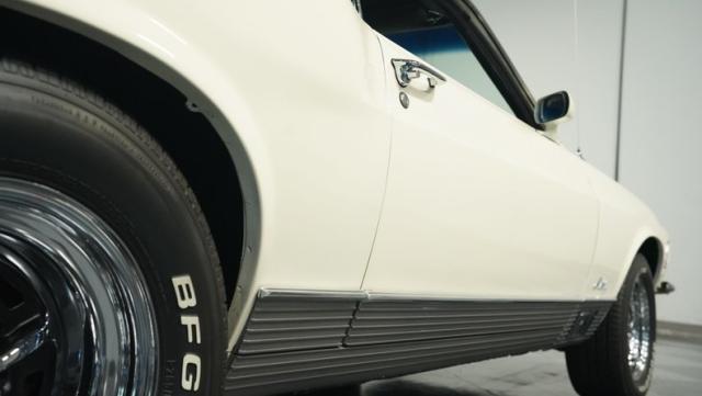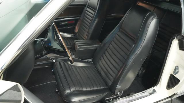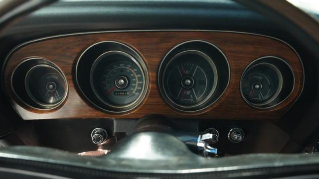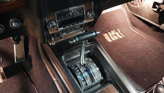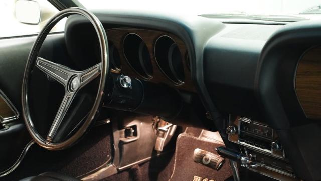 Inside, the black interior is a testament to classic muscle car design. The cabin features bucket seats wrapped in corinthian vinyl, providing both comfort and period-correct style. A floor-mounted shifter for the C6 automatic transmission sits within easy reach, next to the center console that adds a touch of luxury to this performance machine. The original AM radio remains in place, preserving the authentic feel of the era. The rim-blow steering wheel, a unique feature of the time, is not just for show - it\'s fully functional, allowing the driver to sound the horn with a simple squeeze.