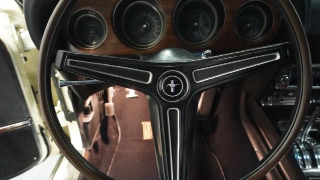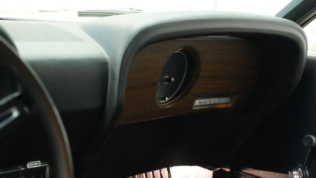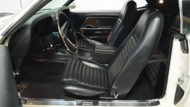 Under the hood lurks the mighty 428 Cobra Jet V8, the heart of this Q-Code Mach 1. This powerhouse is mated to a robust C6 3-speed automatic transmission, delivering smooth shifts and raw power in equal measure. The engine bay is a showcase of authentic detailing, from the factory decals to the Autolite red hoses - a 1969 feature that aligns with this car\'s late \'69 build date. Power steering makes maneuvering this muscle car a breeze, while power front disc brakes provide reliable stopping power. The undercarriage features a 9-inch rear end with a 3.25 gear ratio, striking a balance between acceleration and highway cruising. A MagnaFlow dual exhaust system gives this Mustang its signature growl, announcing its presence with authority.