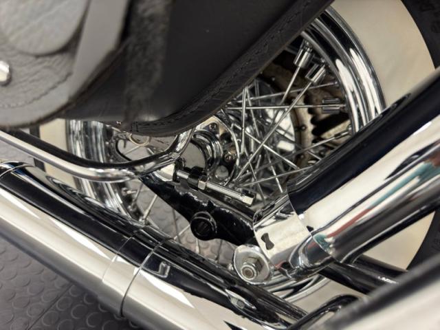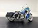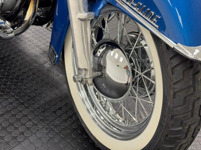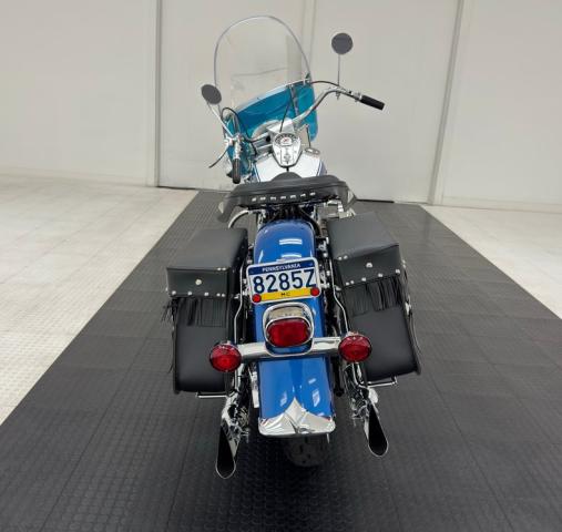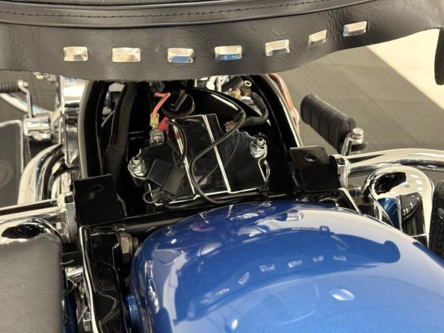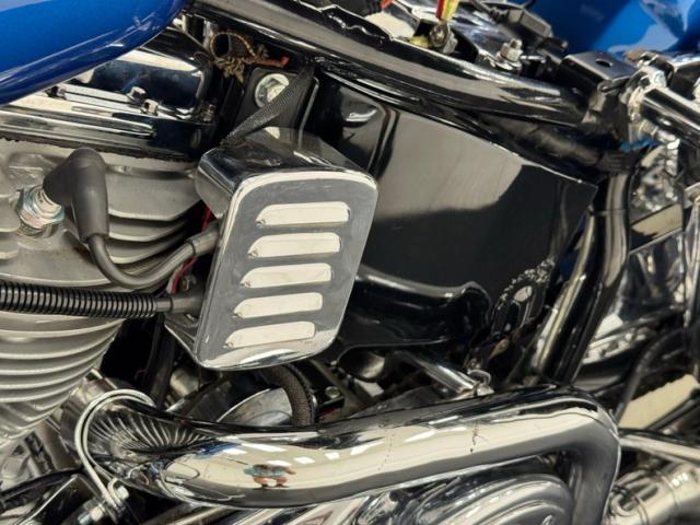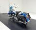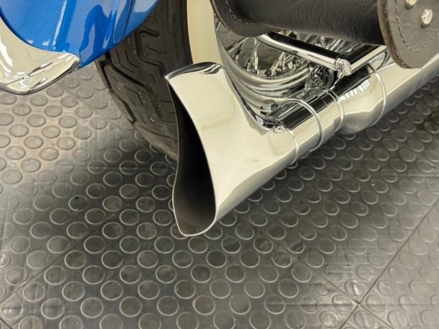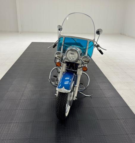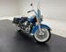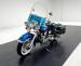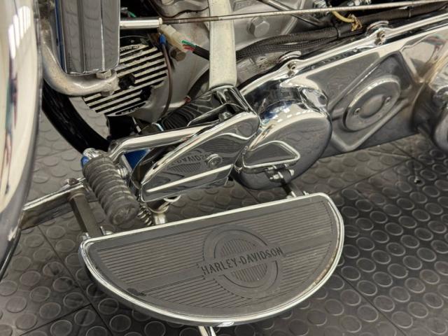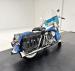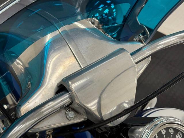 Hi-Fi Blue paint adorns the fenders and gas tank of this classic bike but the color does not stand alone. On the tank, it\'s layered under a white cap and pinstripe and of course, the Harley Davidson badge of each side. On the fenders, the blue is accented with bold edge trim pieces in polished chrome and a Duo-Glide emblem on the fronts. The windshield adds a nice complement with a translucent blue lower half, above chrome tubed engine guards the protrude and gives the bike visual width. All of the external metal is polished to a diamond like shine, especially the pan shaped valve covers which have a subtle Harley logo engraved in the center. Chrome exhaust pipes terminate with flared vertical tips while the wide leather spring loaded saddle is perched ahead of the nicely matched fringed leather and aptly named saddle bags.