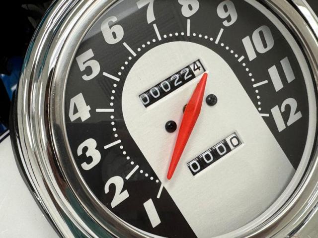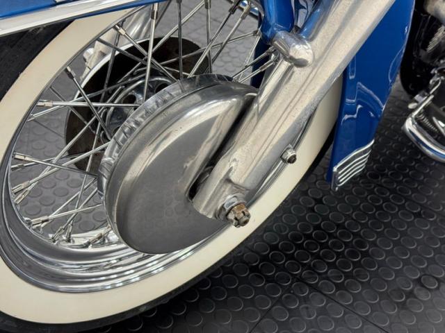Up front, an easy to read speedometer with single digits is houses in a chrome faceplate flanked by polished gas caps. Simple handlebars are accompanied by a only a single push button on each side. 16-inch chrome wire wheels both wear drum brakes. A single headlight with fog lights and amber markers present a bold face up front while triple red lights in back include the brake light and red marker lights. A pair of license plate red reflectors add even more visibility and color to the back.