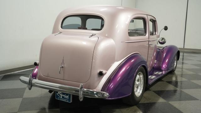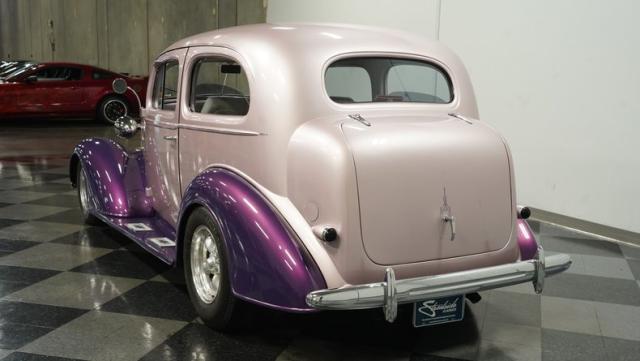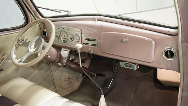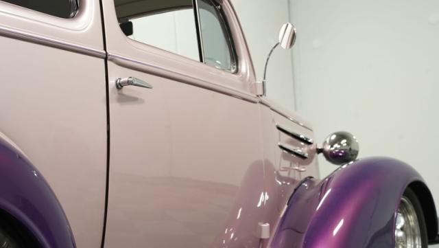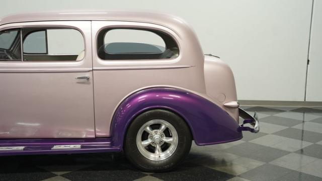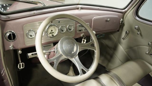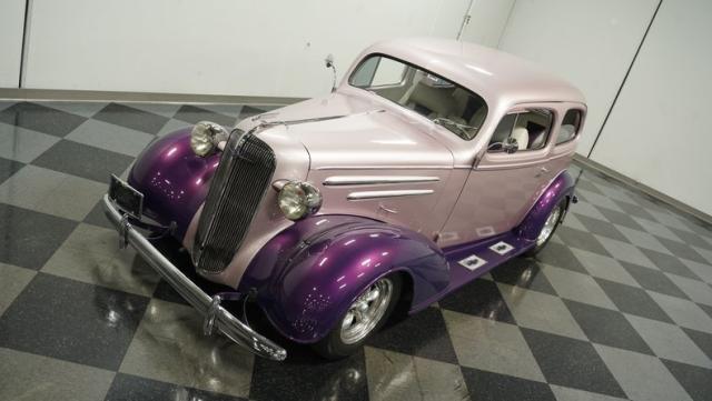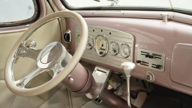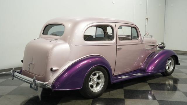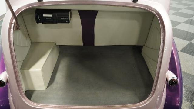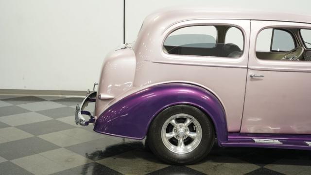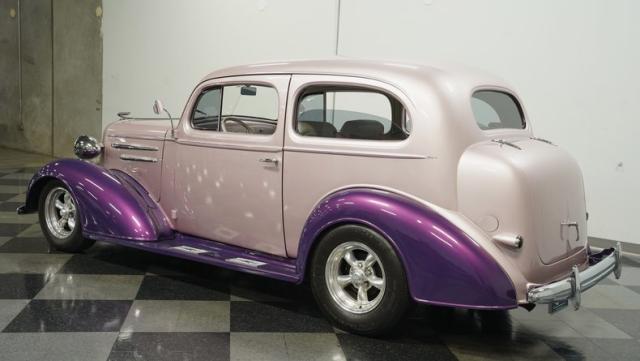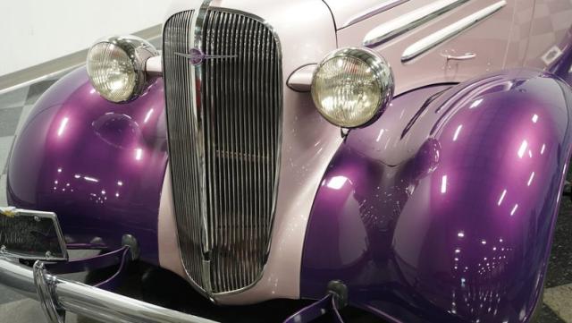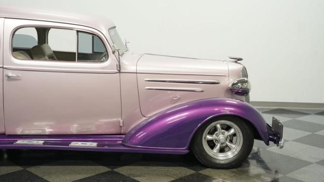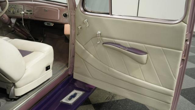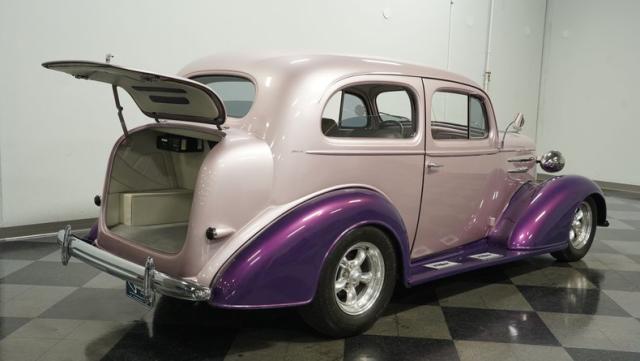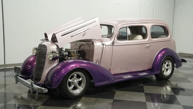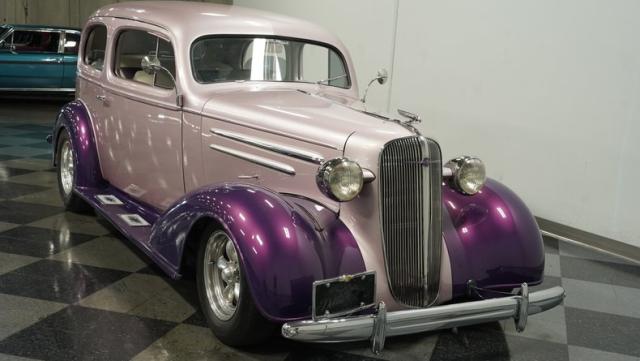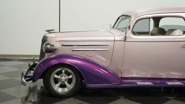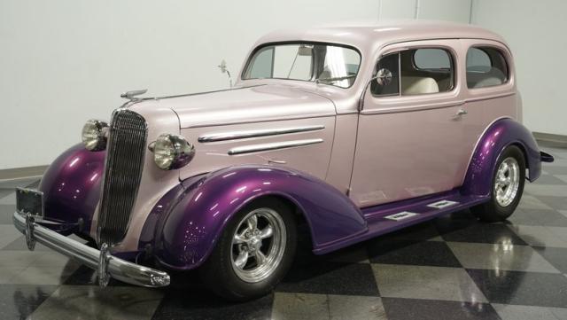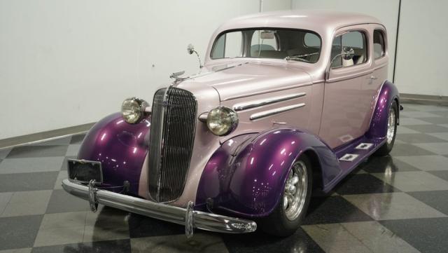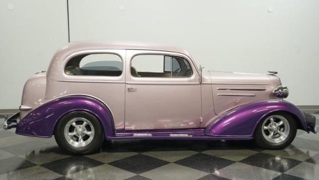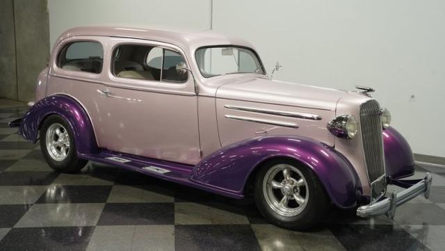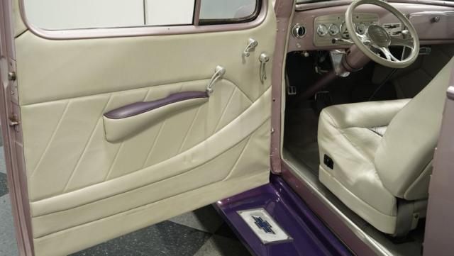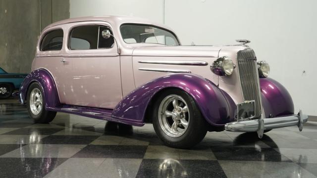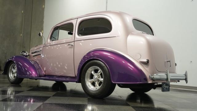 Some of the biggest drawbacks of building your own hotrod are the time, money, and effort it takes to get that car up to anything resembling show-car status. But with this 1936 Chevrolet Master Deluxe, all that work is done. It has been fully repainted in a beautiful soft mauve highlighted by metallic purple fenders and intricate pinstripes. Inside, we find a plush and luxuriously appointed interior, complete with front bucket seats, a console armrest, a set of trick white-faced gauges, and a modern AM/FM CD player stereo system.