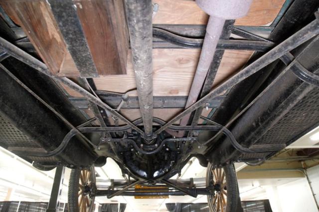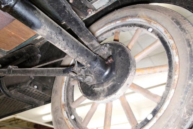 Showing some areas of surface rust, black paint and wood flooring, the undercarriage remains solid and structurally sound. Road dirt and slight surface rust are noted on the underside of the running boards and inside of fenders. Seen for the suspension are transverse leaf springs and mechanical drum brakes for the rear only.