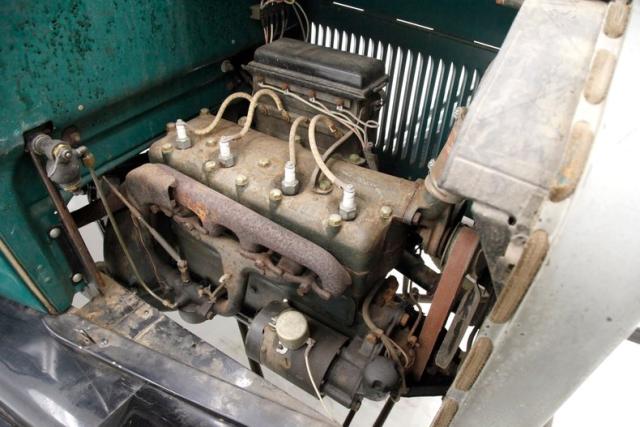 Under the hood is a 177ci inline 4-cylinder engine which is unrestored. A fine covering of surface rust and plenty of patina can be seen throughout the bay. A 1-barrel carburetor feeds this small mill and on the back is a 2-speed planetary transmission that sends power to the 3.64 geared rear axle.