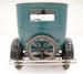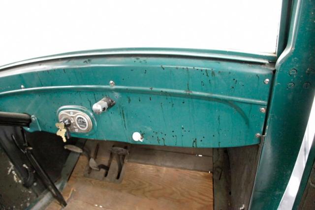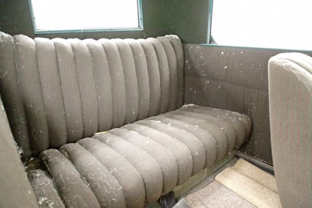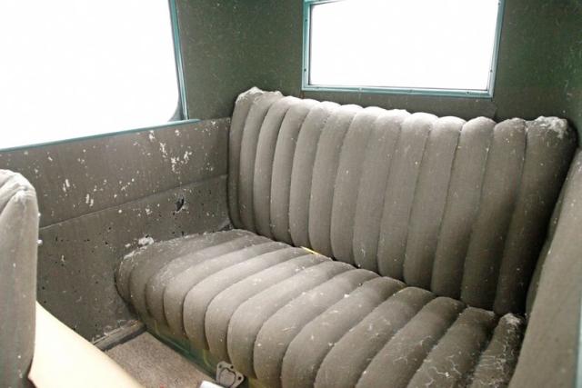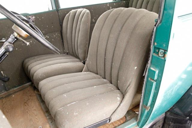 A swing of the door allows us to climb aboard and reveals 2 deeply tufted and padded cloth covered front bucket seats. These show some wear and moth damage in various locations throughout. A matching bench stretches across the back of the car, meeting up with the gray/brown broadcloth inner rear panels The green steel dash in very steampunk styling has oversized round black faced instruments with a tarnished chrome bezel and single knobs and dials as well as the steering wheel which is big and original rising towards the driver. Wood planks are making up the floor and are somewhat loose. Caressing the sides of the front buckets arematerial and color matching door panels with shiny chrome cranks. These panels have succumbed to heavy moth damage and will need replaced. The Model T pedal setup is there for you to figure out!