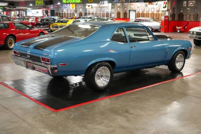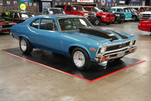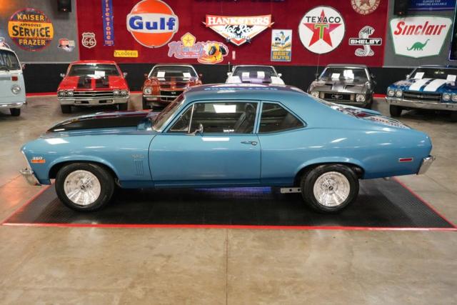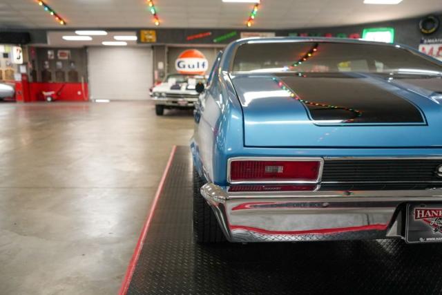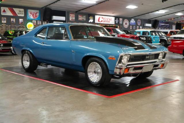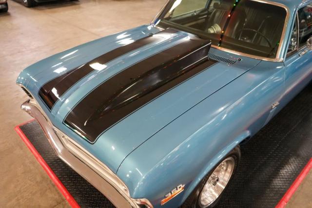 This 1972 Chevrolet Nova is a serious street machine built for performance. Powered by a 350 Small Block Chevy V8 with aluminum heads, it\'s backed by a TH400 automatic transmission and a 12-bolt POSI rear with aggressive 4.11 gears. Long tube headers, an Edelbrock aluminum intake, Brawler 4-barrel carburetor, HEI ignition, and aluminum radiator enhance power and reliability. Equipped with power steering, power brakes, and front disc brakes, it offers confident control. The black vinyl interior keeps it classic, while 15-inch American Racing Outlaw wheels and staggered Cooper tires complete the stance. Finished in blue with black stripes, this Nova means business.