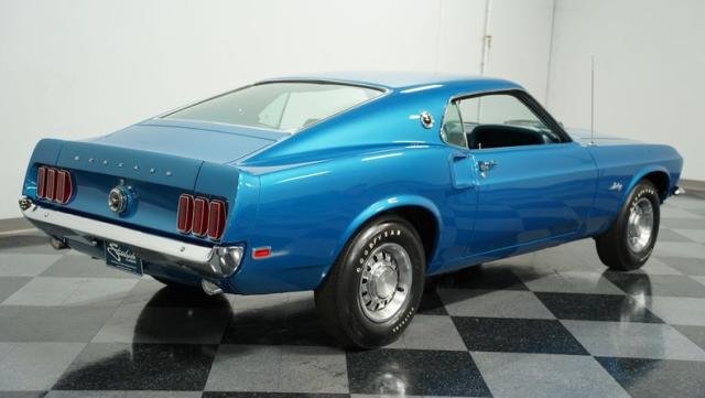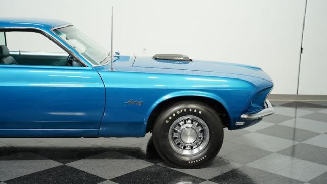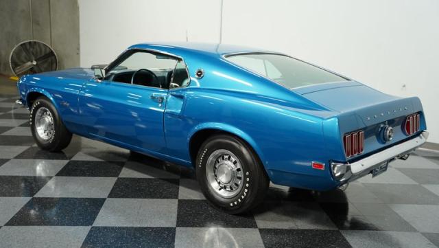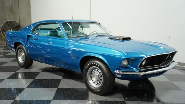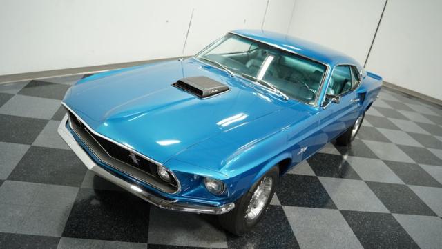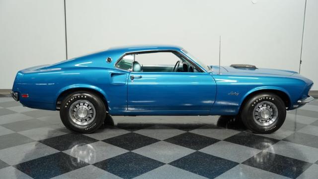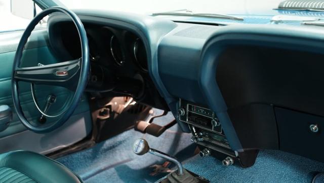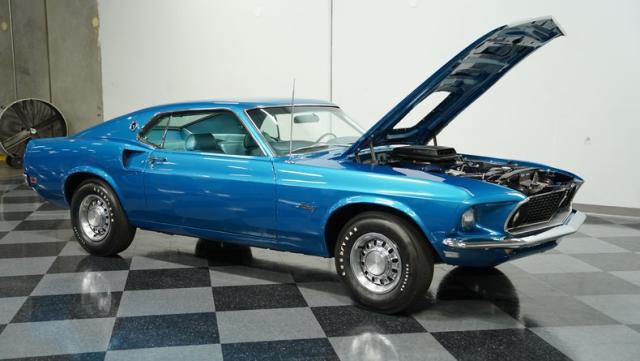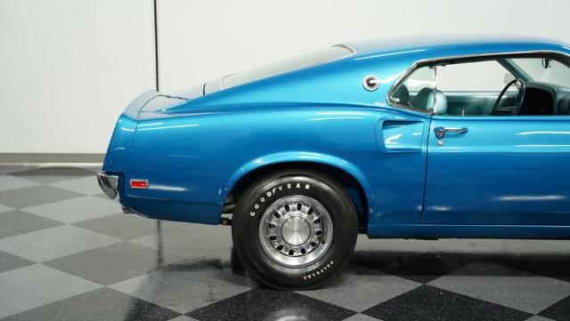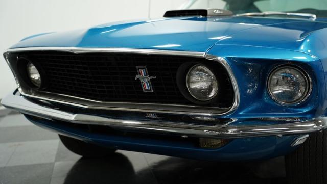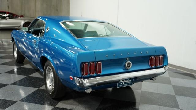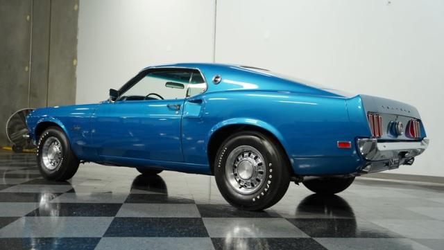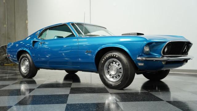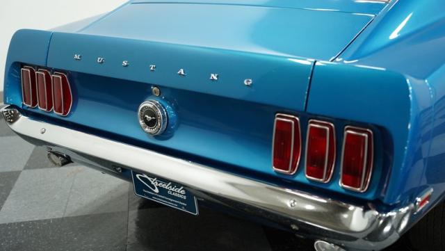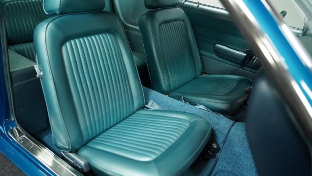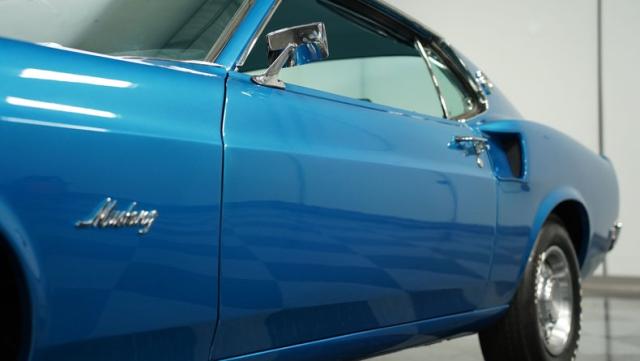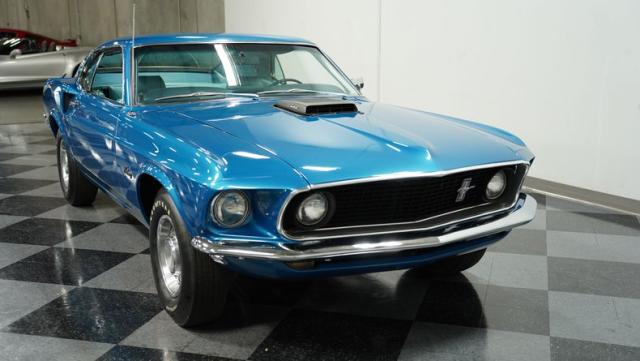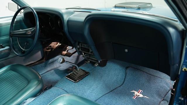 Inside, the original blue vinyl bucket seats and floor shifter create an authentic and immersive driving environment. Externally, the Mustang\'s fastback body style is as eye-catching as it was in 1969. The full repaint in its original Acapulco Blue, combined with the absence of stripes, gives the car a sleek, uninterrupted look. The suspension setup, featuring MacPherson struts at the front and leaf springs with shocks at the rear.