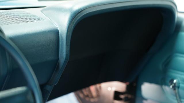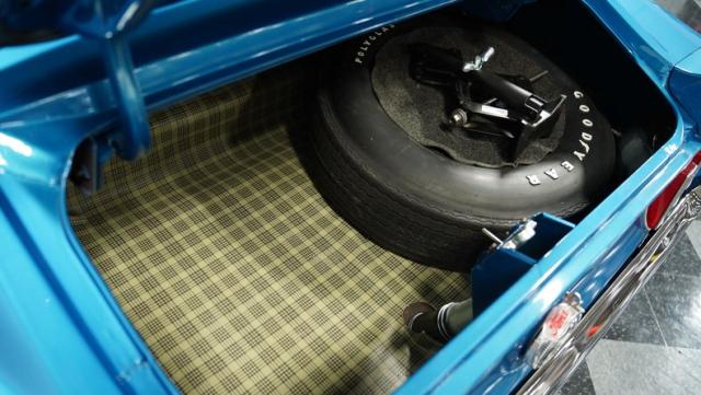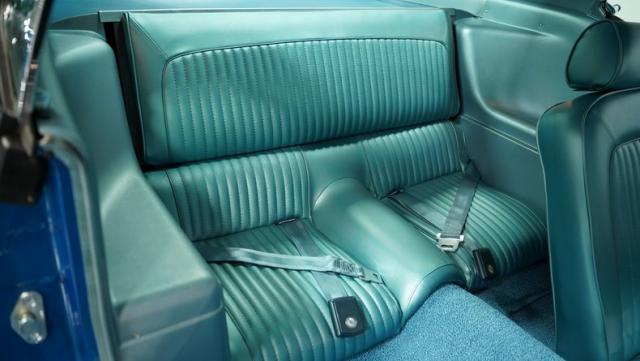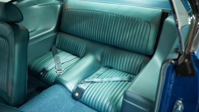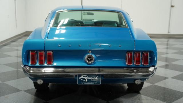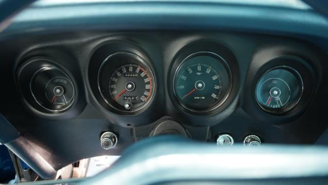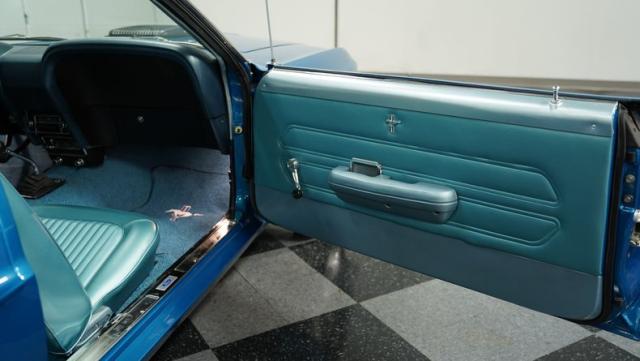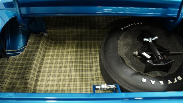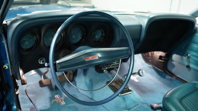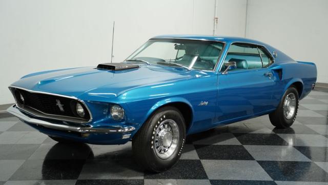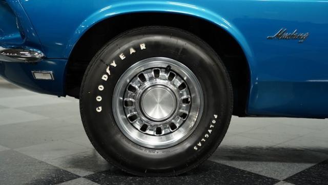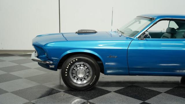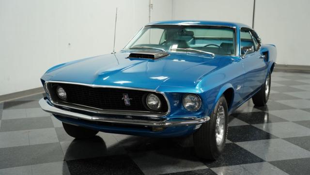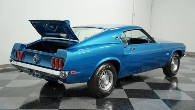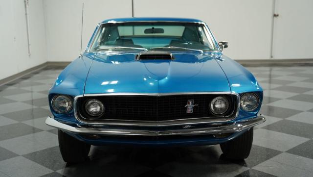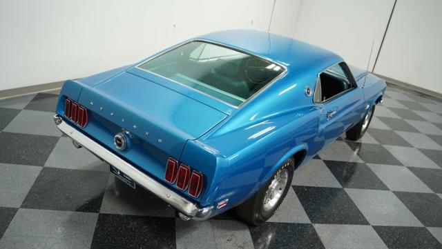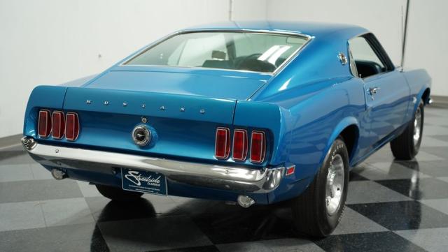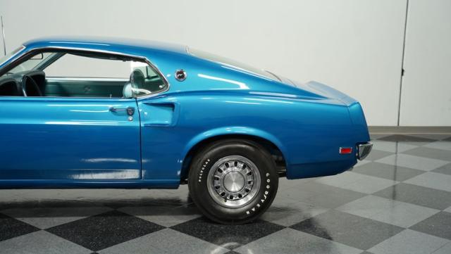 Inside, the original blue vinyl bucket seats and floor shifter create an authentic and immersive driving environment. Externally, the Mustang\'s fastback body style is as eye-catching as it was in 1969. The full repaint in its original Acapulco Blue, combined with the absence of stripes, gives the car a sleek, uninterrupted look. The suspension setup, featuring MacPherson struts at the front and leaf springs with shocks at the rear.