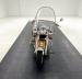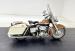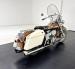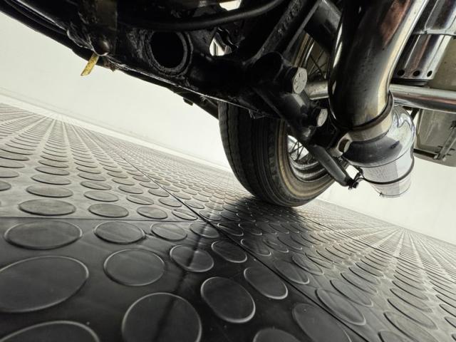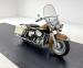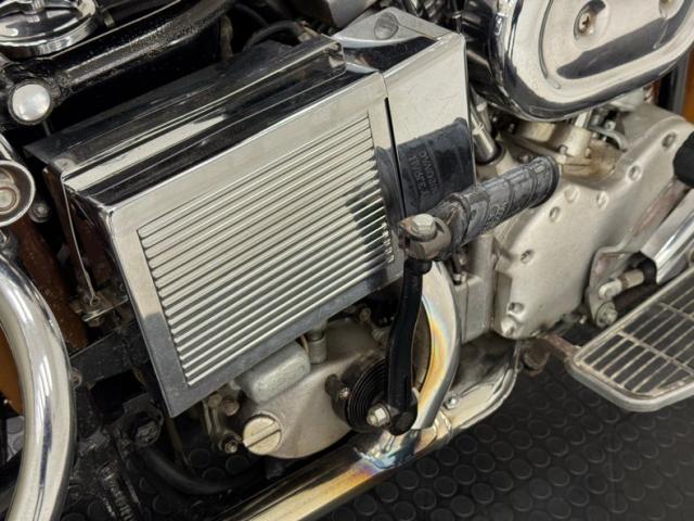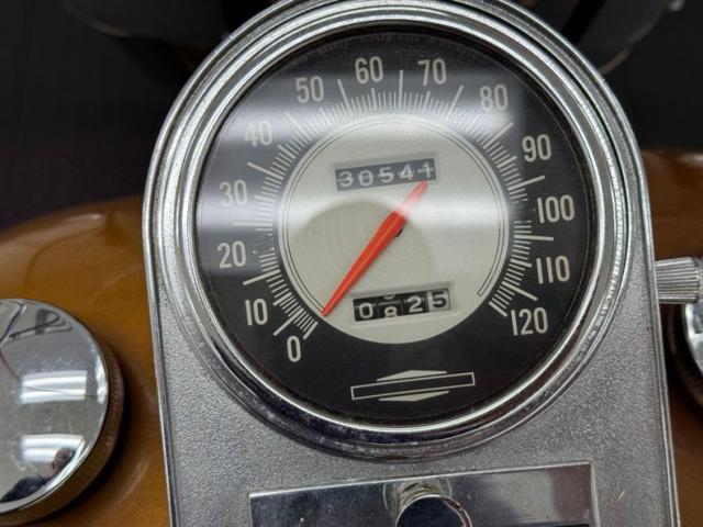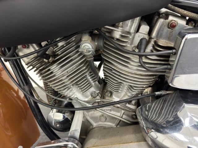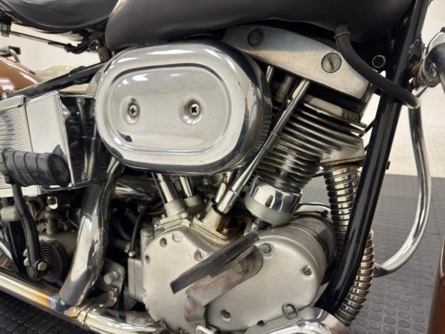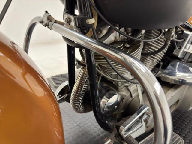 On board we have the 74ci shovelhead V-twin, rated at 60 horsepower and receiving fuel through a Tillotson 1-barrel carburetor. The 4-speed manual transmission spins the rear wheel with a chain driver and drum brakes are front and rear. The dual exhaust is shiny all the way through, and especially as it terminates through chrome mufflers. Suspension consists of a telescopic fork in front and a swing arm with coil overs in back.