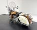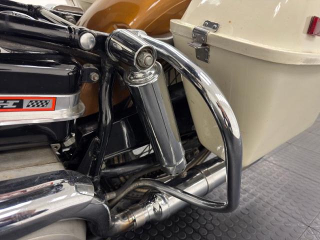 Period confirming Gold paint colors the fenders, top half of the tank in conjunction with a flat black lower half, and the frame around the windscreen, while cream colored saddle bags are hitched on back flanking a parcel rack. Electra Glide in script emblems are expressed on the front fender that is also trimmed in stainless and capped by an engraved plate up front mirroring the shape of the Harley badges on the gas tank. The headlight is housed in a robust, steel encasing and flanked by fog lights above dark amber lights. Out back, red marker lights cap the end of a metal band over which the tail light presides and another stamped plate decorates the fender. Our black leather saddle is adorned with a row of rhinestones in back.