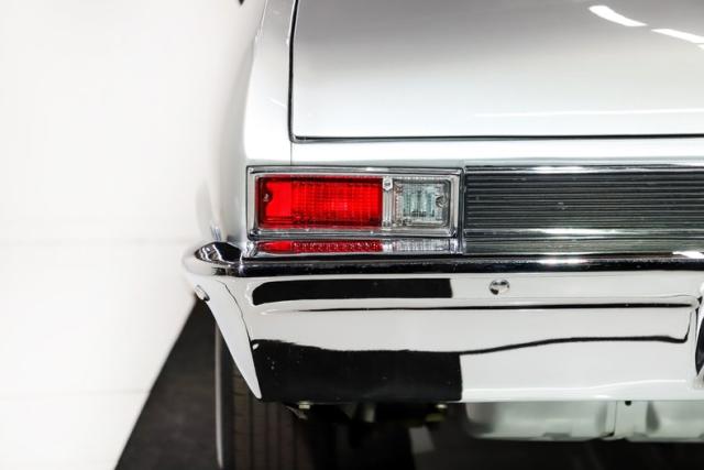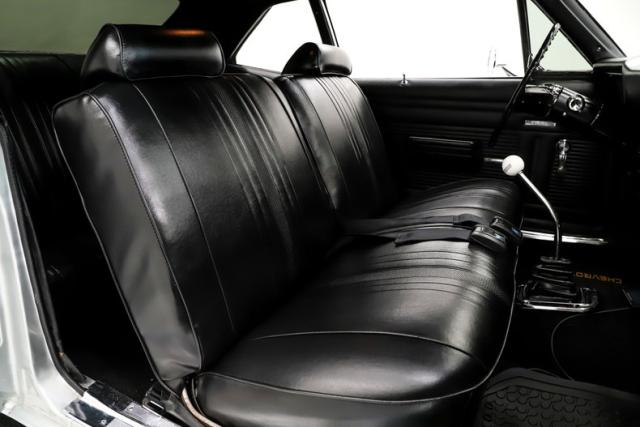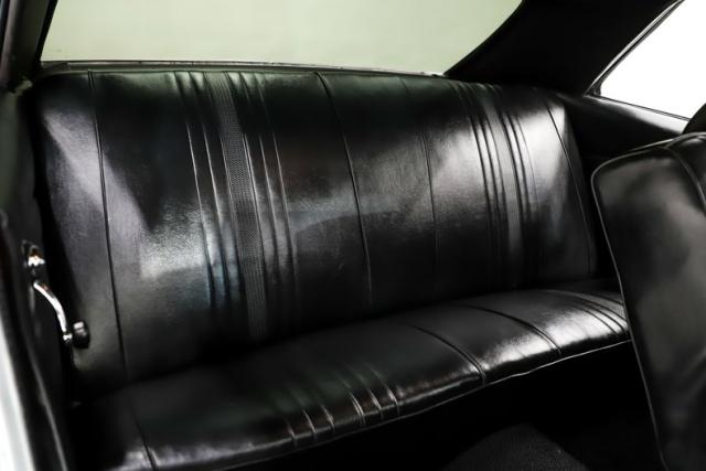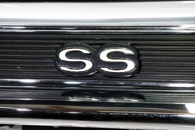 EXTERIOR: Tough yet tasteful! The steel cowl induction hood, fender mounted 427 badges, SS trim, tinted windows, and big fat tailpipes peeking out behind the rear tires really give this car a sinister look. The Cortez silver paint has been neatly applied and polished to a slick and reflective finish. Looking down the side of the body it is nice and straight with smooth contours and crisp lines. All the panels have been painstakingly aligned and the doors close easily with minimal effort. All the bright work has a lustrous shine. The bumpers have been re-chromed. The headlights and tail lights are both crystal clear. It\'s rolling on a set of 15 inch radial redline tires mounted to body colored still rims with poverty hubcaps.