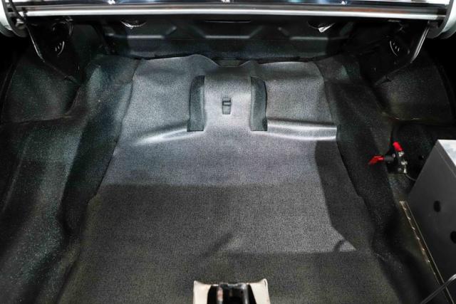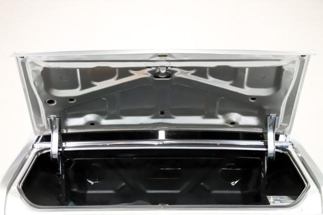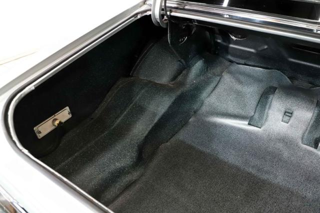 TRUNK COMPARTMENT: The underside of the trunk lid and inside the jamb are both painted Cortez Silver. The weatherstrip was replaced and the trunk light works. Inside is a very practical master kill switch linked to the relocated battery inside a Taylor safety box. The trunk pan is all clean rust free metal with a neatly applied spatter finish paint.