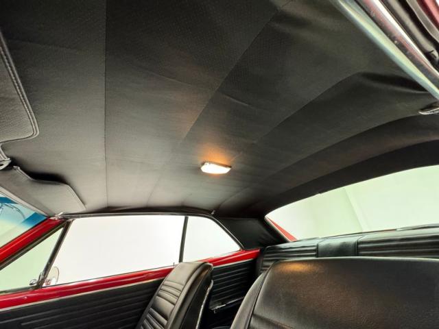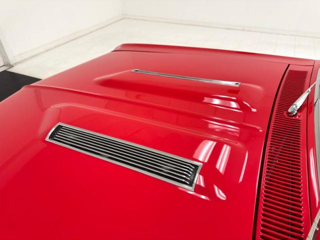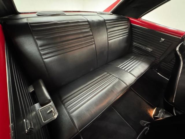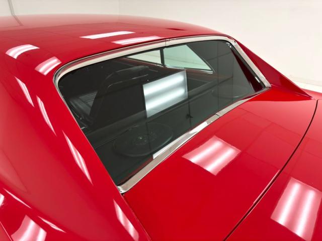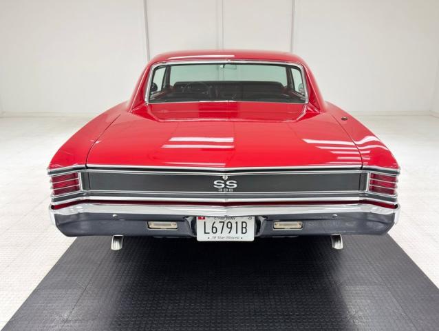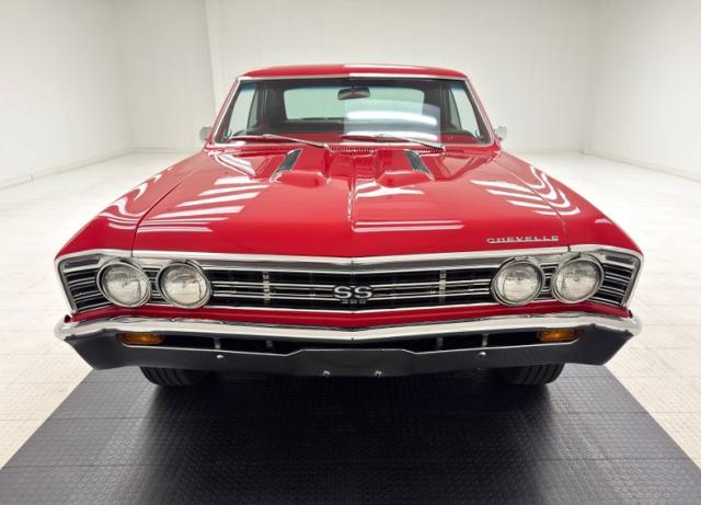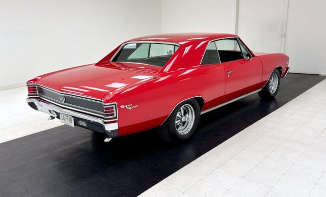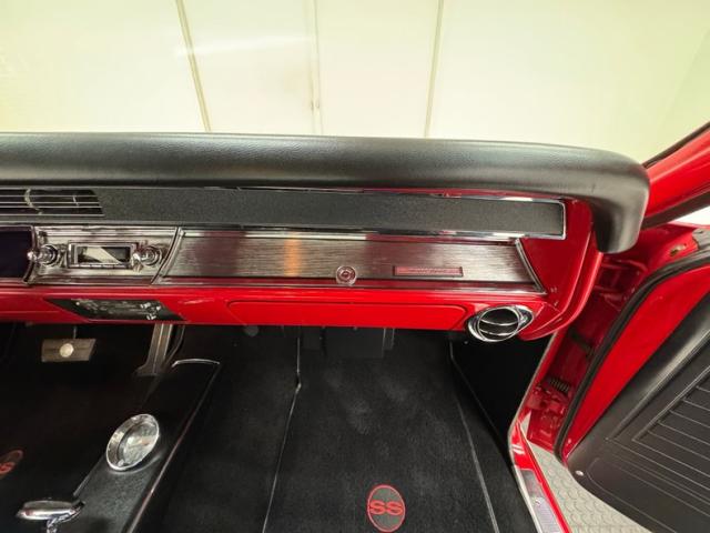 The two stage Bolero Red paint is hotter than a fire engine and covers the long, steel panels of this car with perfection. Chevrolet got it right in \'67 with a well done balanced design and with the SS additions that include the vented bulges on the hood, providing a more muscular profile. The chrome is in great shape and the narrow grille, dual round headlights, and accenting bezels that mirror the grille also look fresh. From the back, its symmetrical eye candy with twin buttresses, finely gapped trunk lid, and ribbed tail lights bookending a spectacular black panel detail while reverse lights flank the license plate in the bumper and exhaust tips emerge underneath. More chrome is found on the 15-inch Cragar SS wheels with staggered size wheels, solidifying the car\'s muscular stance. We could find no glaring exterior imperfections on this \'67.