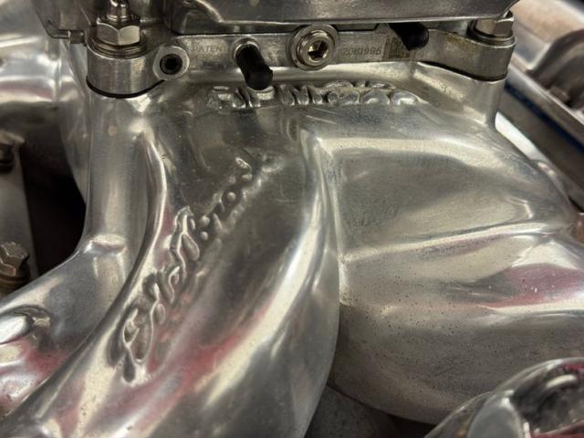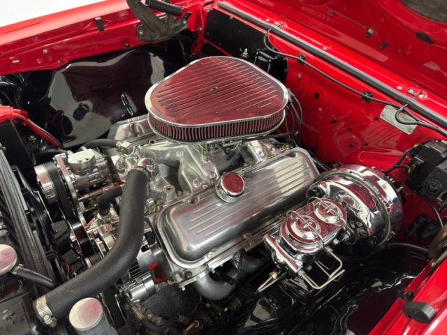 The show continues under the hood where polished parts outnumber those that are not while glossy black inner fender wells reflect the chrome like a mirror. Here we have a Blueprint 502ci V8 with aluminum heads, an Edelbrock intake, and a Holley Sniper 2 EFI system on top. It\'s backed by a Monster 4L80E 4-speed automatic transmission with a Holley trans cooler and a 12 bolt Moser rear with 3.73 gears and Positraction. If you don\'t win for best body and paint, you\'ll have a good shot at best engine bay with this fantastic presentation. Coated headers start the exhaust process.