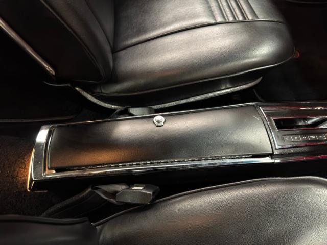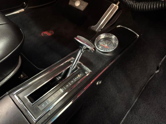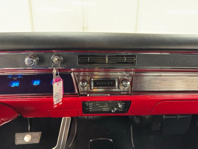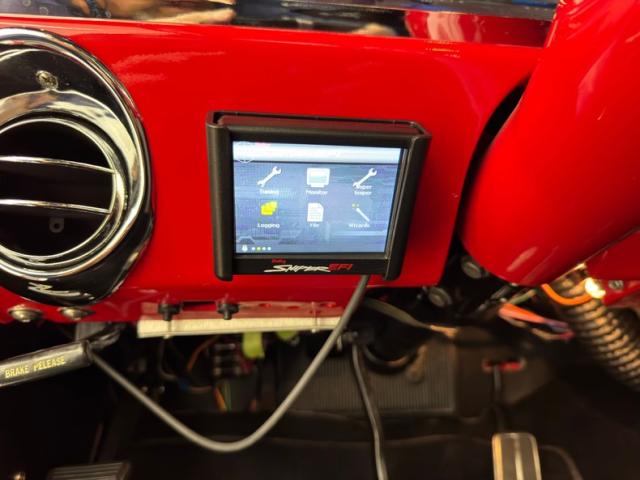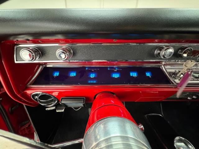 Black ribbed vinyl is used on the door panels that carry electric window switches, four for the driver, one for the passenger on spotless doors. The bucket seats are also showroom like with tight, smooth black vinyl that is mirrored by the rear bench and back sidewalls which also feature window switches. A three spoke steering wheel fronts a digital dash, black when off and illuminating with blue digits when on, fitted into the dash as if Chevrolet put it there. But it\'s back to \'67 to the right with an AM/FM radio and standard A/C panel in the red painted lower dashboard, and striated metal panel above the glovebox on the right. The Holley Sniper screen is mounted to the left of the steering wheel and a center console houses a clock and a T-shifter in its faceplate with gear indicators to the right. Black carpet below, a stitched headliner above, and a trunk finished with black carpet are all immaculate and show worthy.