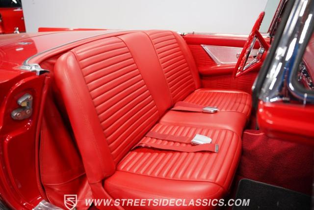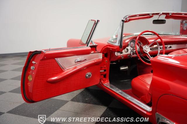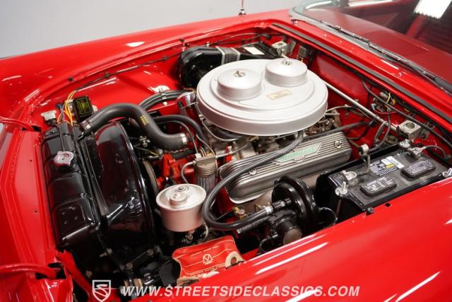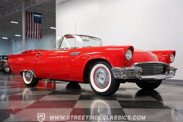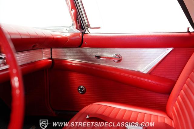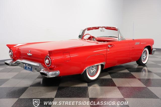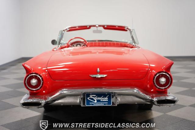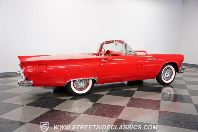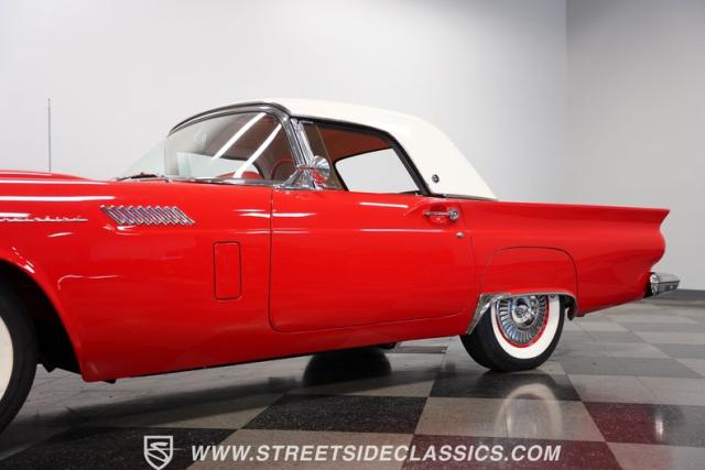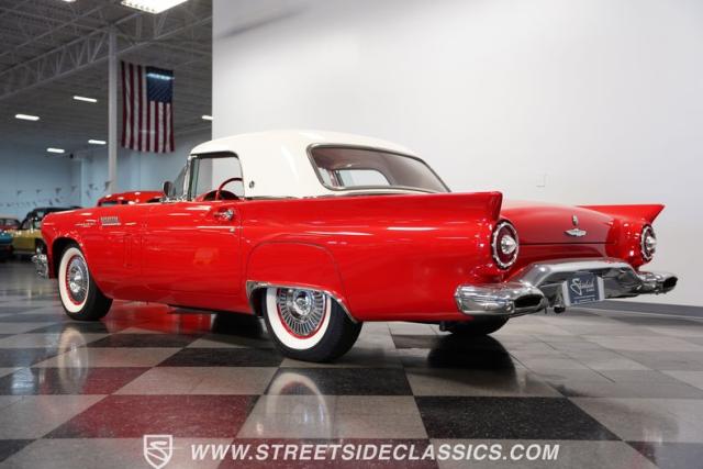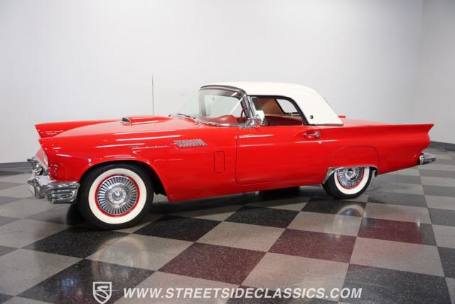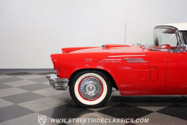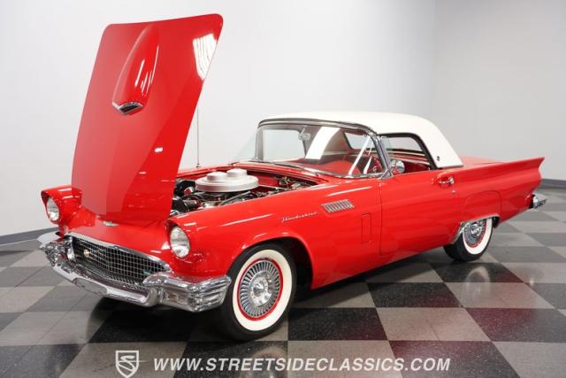 This 1957 Ford Thunderbird has all the best details you love about the first generation that launched the icon. It has a sporty yet sophisticated red-on-red style when it\'s a convertible, and when you put the hardtop on, the white roof goes with the wide whitewalls for a subtle two-tone. The brightwork is brilliant in all the best places, including the rear bumper with integrated exhaust, factory wheel covers, windshield, and hood scoop. And we especially love the look of the \'57 front end that arguably had the cleanest and most well-integrated bumper/grille design. It all makes for a package that\'s sharp, luxurious, and detail-oriented - right down to the super-clean undercarriage. But the best detail of them all is under the hood. The VIN tells us this is a factory E-code Thunderbird, which means dual-quad V8 power. And since you\'ll be talking about the powerhouse so much, they even made sure that the clean and detailed style of this T-Bird extends to the engine bay. Incidentally, according to the owner, this car has never been in the rain or washed, in the traditional sense, since it has been restored, which is also believed to be reflected on the odometer.