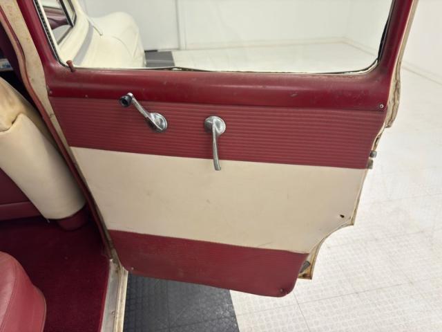 Let\'s start in the back where the doors open clamshell style and reveal a bright red carpeted mat on the cargo area flanked by maroon vinyl on the sidewalls and inner fenders. The material on the tailgate shows its age with cracking and peeling. Each door panel sandwiches a beige insert between a textured maroon strip and a smooth one and all doors are in good condition with the driver\'s showing some definite use. Our vinyl bench is torn on the side, but the sitting surface is otherwise intact and features added three point seat belts. The rear bench is a lighter shade of red, has no beige accenting, and presents in good condition, also benefiting from added seatbelts. The patina and originality is evident on the beige steering wheel and the two tone dash with an offset speedometer and vertical gauges in twin, oval housing. The red loop carpet shows some appropriate age and the liner of the driver\'s footwell is cracked with age. The headliner is in excellent condition and the windlace that surrounds the driver\'s portal is frayed.