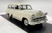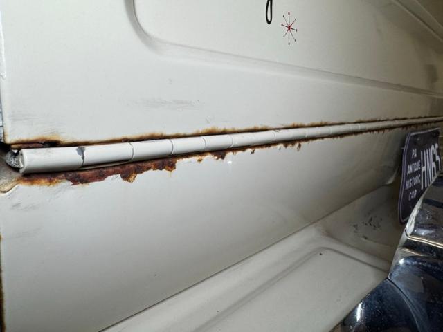Shoreline Beige presents as off white and it must\'ve taken a few gallons to cover this large wagon and its slick top. The 15-inch wheels also carry the color for some nice coordination with dog dish hubcaps and a shine that picks up nicely on the shoulder line trim, the door handles, and the parts of the bumpers that wrap around. Before the influence of Ferrari on the \'55, there was this up front, a bold, chrome, toothed grille, robust bumper with torpedo like bumper guards, and bright headlight rings, all in good shape. With some slight pitting, the half bird/half plane hood ornament surges forward over the classic Chevrolet crest on the nose. Out back, the vintage wagon shows an almost barn like design, flat like a wooden fence flanked by oblong tail lights in chrome nacelles at the end of the pronounced rear fenders. Imperfections include cracking paint, chipped paint, touches up scratches and chips, surface rust on panel edges and all along the piano hinge in back.