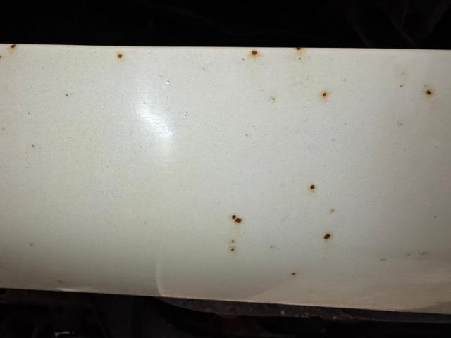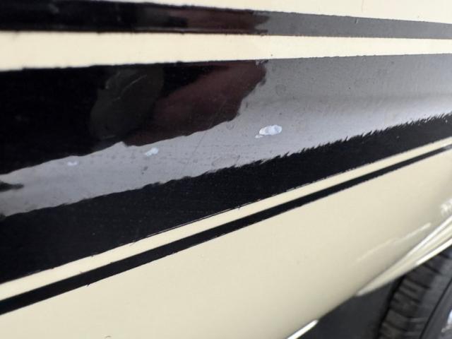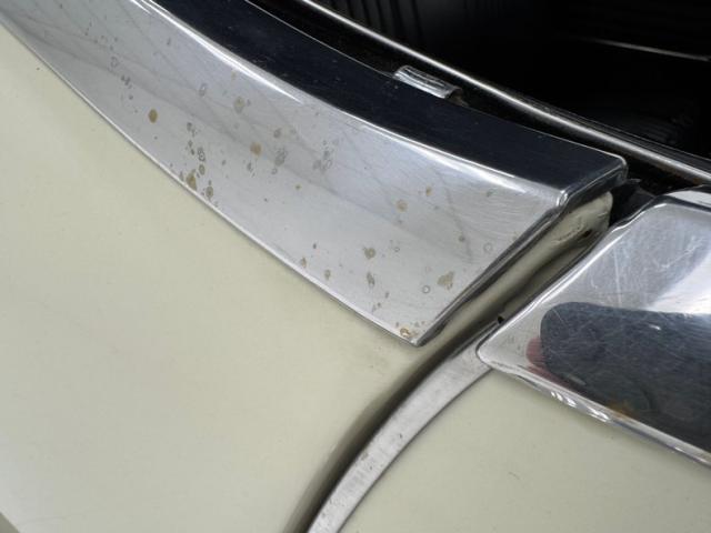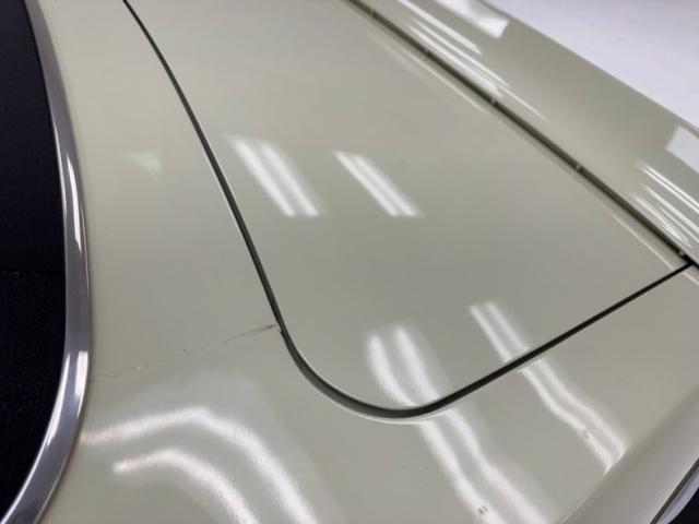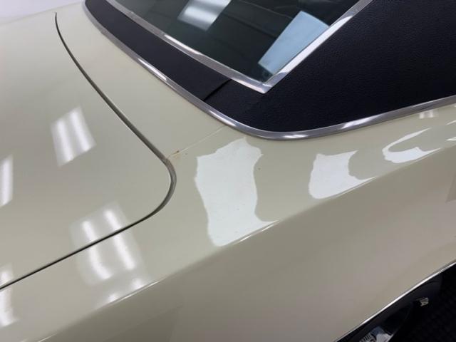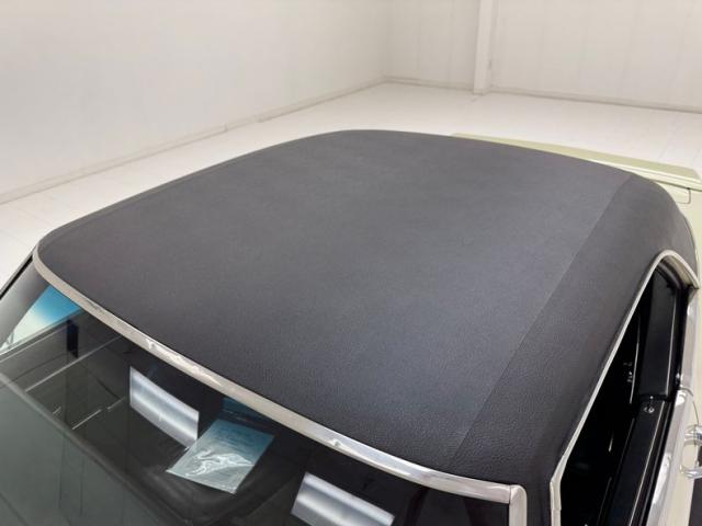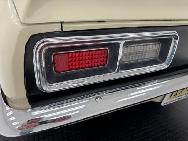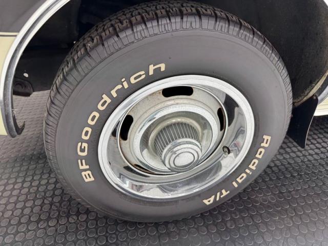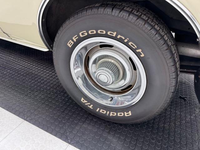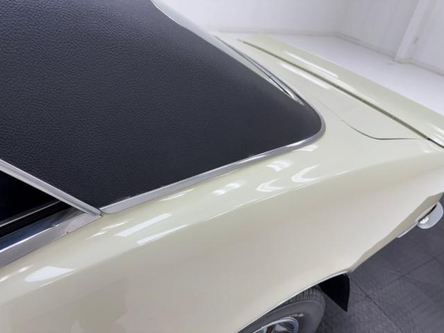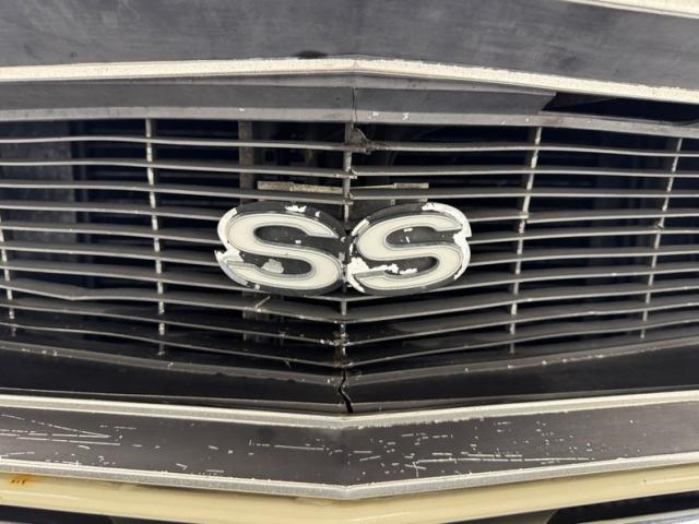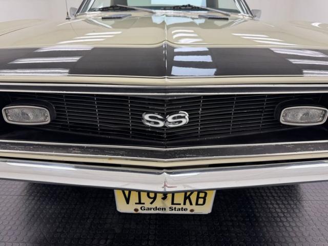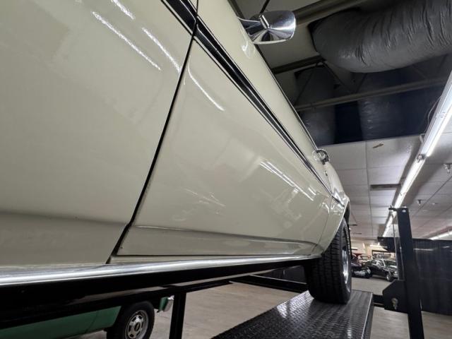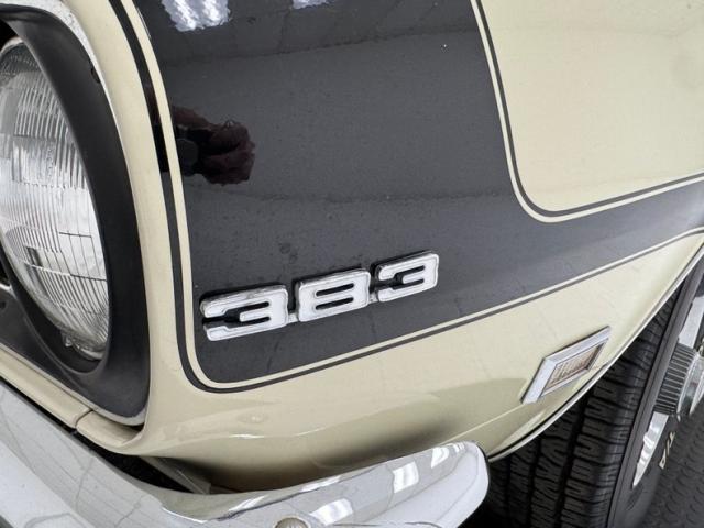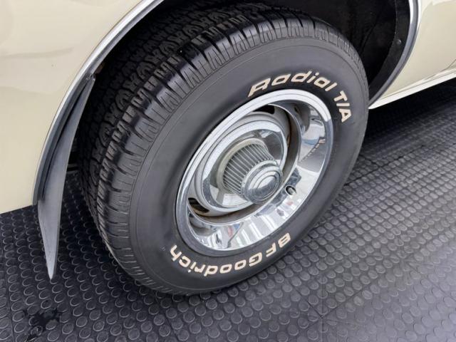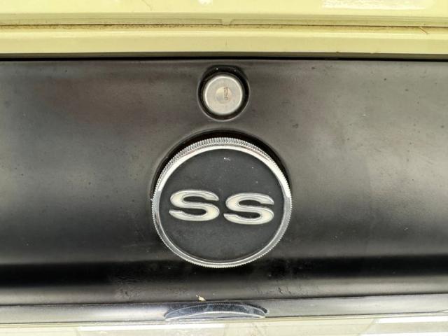 Now wearing a two stage version of the car\'s original color, you can\'t call Palomino Ivory white, it really is a true iteration of ivory, accentuated here by black features that include a nose stripe that trails back as a diminishing side spear, complemented by the black vinyl top and black rear fascia framing the two part tail lights under an upright spoiler. Faux hood vents add some sporty aggression while SS emblems pay tribute and a 383 badge reveals the power source. Naturally, the 14-inch Chevrolet Rally wheels are ideal in profile and mud flaps front and rear keep the lower panels clean. Imperfections here include chipping paint on the front SS grille emblem and a crack in the plastic surround, some spotting on the stainless on the window sill, a slight separation of the vinyl top at the C-pillar, a rust colored crack and staining in the stiffening folds near the trunk, panel and door edge chips and some bubbles, and some rock chips on the front apron.