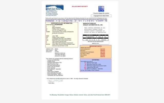 INTRODUCTION: Highly documented, VIN #s matching motor! Concours restored to factory condition and the judging sheets are included, it scored 655 points out of 661! There were only 789 Shelbys total in 1970, of those only 117 were GT350s with an automatic and only 87 were in these colors. Factor in air conditioning and how many survived- this is an extremely rare car! Documented with original invoice, order report, concours judging sheets, Marti Report and it is listed in the Shelby Registry.