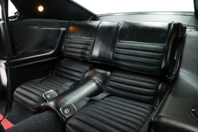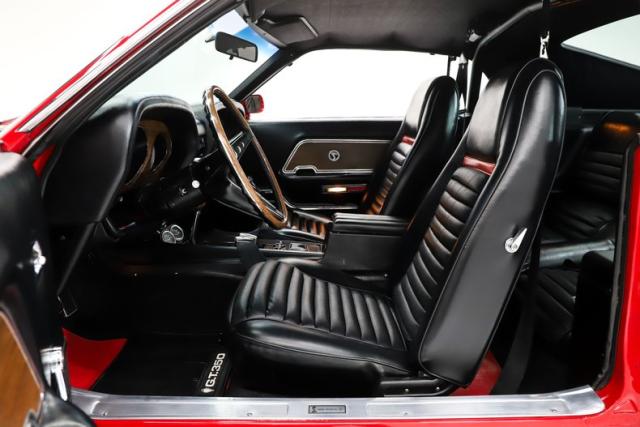 INTERIOR: Shelby\'s upgrades werent just limited to the exterior, there\'s plenty inside too! The deluxe interior is in great shape from carpet to headliner. The most notable Shelby feature is the roll bar with shoulder harnesses, actually all the seatbelts have Shelby logos. The consoles were also upgraded with a padded armrest, toggle switches and gauges. Shelby logos are throughout including on the wood shift handle. This one also features a factory tachometer, fold down rear seat, tilt away wheel and red mats sewn into the carpet. The radio is upgraded to a retro stereo that looks original with factory style door speakers.