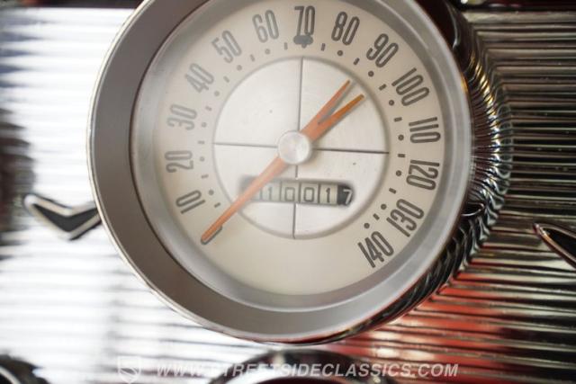 The color-matched interior blends vinyl and cloth and really looks sharp. As you lower yourself into the driver\'s seat and take a glance around, you\'ll notice that there is plenty of space to accommodate four full-sized adults. The seating is in good shape, with front buckets that show only the slightest of wear and a rear bench with contoured backrests that not only give it a distinctive appearance but are also very comfortable. The white, factory-style steering wheel offers a nice bit of contrast, and just beyond it there are some really striking visual elements, including a chrome instrument panel that houses a collection of clear, white-faced gauges and an intricately detailed center console. At the center of the dash, a retro-style AM/FM/Cassette stereo has been seamlessly installed in place of the original radio.