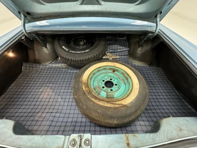 Our consignor states the interior is original, so let\'s get into it! Blue vinyl door panels are full of horizontal lines and metal hardware and accents and appear in good condition with some patina on the armrest and some separation on the hinge side of the panel. The split bench seats are in great shape and just like the brochure says, combines vinyl outers with Jacquard fabric in light blue and this pattern is repeated on the immaculate rear bench. While back here, we note some fraying on the cloth lining at the door jamb on both sides. The blue steering wheel and horn ring show some patina, and the wonderfully simple horizontal dash looks good with a ridge trimmed lower accent that extends end to end. In the middle are an AM radio and push button vent controls. Under the fitted dash cover, the dash pad is cracked in several places and generally faded, but the blue looped carpet on the floor is in good condition. The massive trunk is mostly barren with the exception of a plaid mat and two spare, steel wheeled tires.